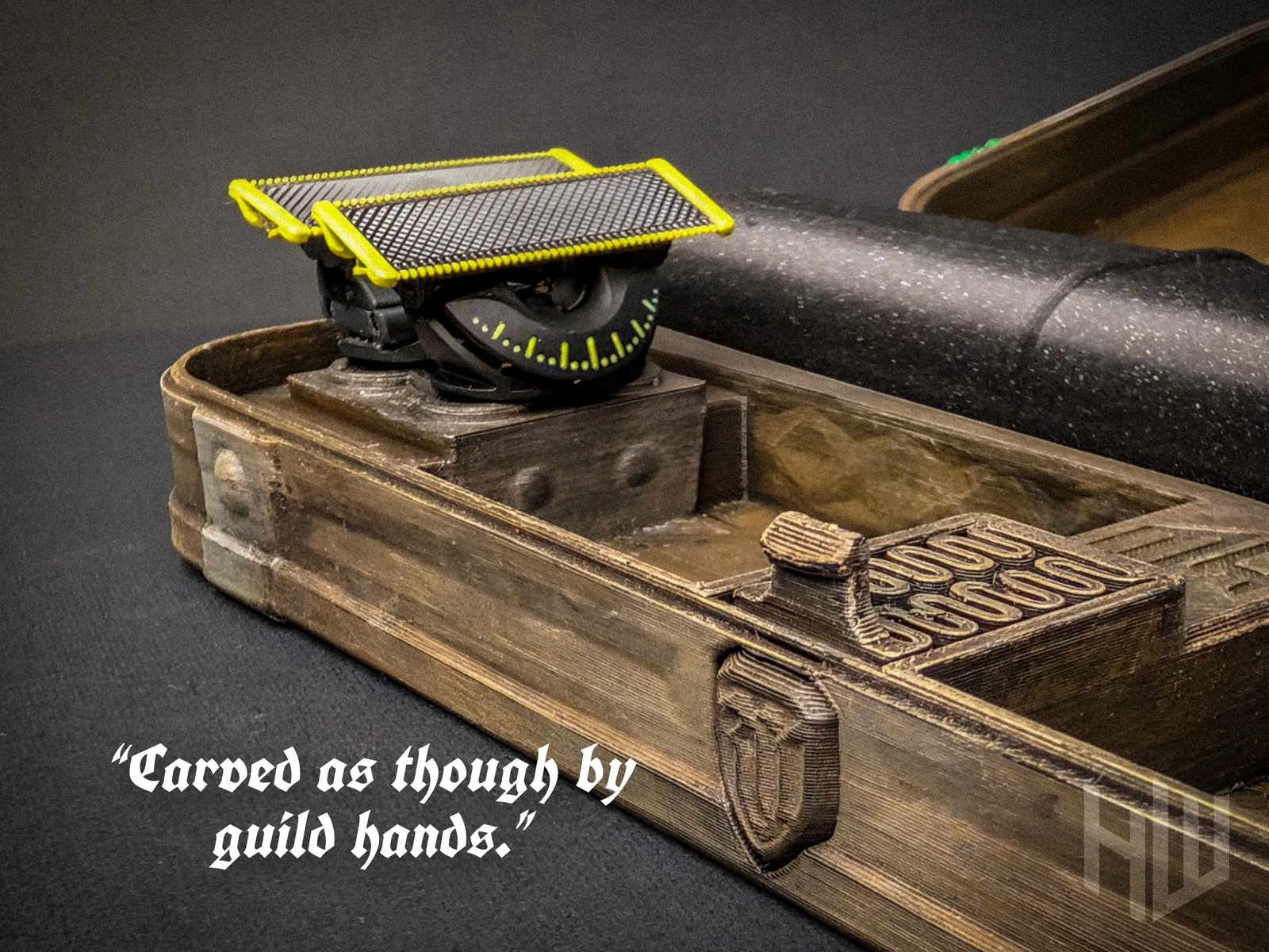 Đây là Knight's Grooming Chest. Một hộp đựng du lịch lấy cảm hứng từ Kingdom Come: Deliverance II, được thiết kế riêng cho Philips OneBlade 360 QP4631/65, bao gồm cả bản Kingdom Come II Limited Edition. Mẫu này không vừa các biến thể OneBlade khác.