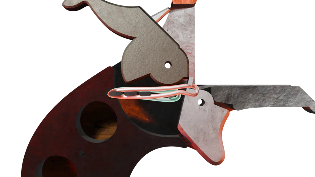 Ở một khẩu derringer “thật” kiểu này, búa sẽ có cơ cấu đồng hồ (clockwork) bên trong để kim hoả đổi lên/xuống sau mỗi phát. Bên trong sẽ có cam, pushrod, v.v. Phần này mình thấy quá lặt vặt để thiết kế (và nhìn từ ngoài cũng khó nhận ra) – nhưng bạn cứ thoải mái remix nếu muốn thử thách! Bạn có thể lấy CAD onshape của mình ở đây – (lưu ý cái này vẫn còn hơi WIP)