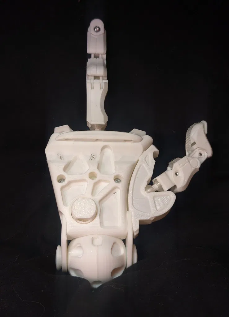 Cứ thoải mái dùng theo ý bạn. Mình in các miếng đệm mềm ở ngón/palm bằng TPU trong mờ (translucent), còn lại bằng PLA rẻ. Thiết kế dùng khoảng ~26 vít M3 dài 10mm và ~4 vít M3 dài 6mm. Bạn hoàn toàn có thể thiết kế lại để dùng ít hơn, hoặc thậm chí không cần vít — nhưng một mục tiêu của bản này là tạo bề mặt kiểu phức tạp, đầy phần cứng (hardware-filled texture).