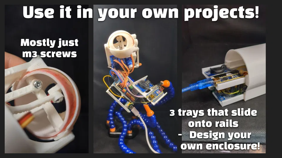 EDIT: Đã thêm bản “v5” – giờ bạn có thể lắp con mắt mà không cần phải nhét nó vô trong enclosure trước; sau đó mới gắn enclosure lại chỉ với 2 con ốc. Dễ recalibrate, sửa chữa, v.v. hơn nhiều. Đồng thời cập nhật để dùng USB-C. Các file v4 cũ vẫn nằm trong file ZIP. Tuy nhiên – một phần tài liệu hướng dẫn đã bị lỗi thời. Cụ thể: mình khuyên dùng bản code mới nhất ở đây – nhưng bạn sẽ phải tự kiểm tra kỹ xem chân servo pins các kiểu có khớp với bản build của bạn không.