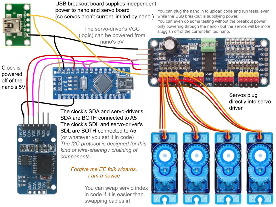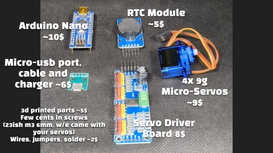 Vật tư cần có: Arduino Nano ~10$ (3 cái 20$) Time Module ~5$ (2 cái 7$) Cổng USB-C, cáp và sạc ~6$ (10 cổng 6$, có thể bạn đã có sẵn cáp và củ sạc USB) 4x micro servo 9g ~9$ (5 cái 9$) Servo Board 8$ (2 cái 14$) Phần in 3D ~5$ Một ít tiền ốc (cỡ 30 con m3 6mm/3mm, cộng thêm mấy con đi kèm servo; có thể cần vài con nhỏ hơn cho phần điện tử, hoặc dùng zip ties). Dây điện, jumper, thiếc hàn ~2$
