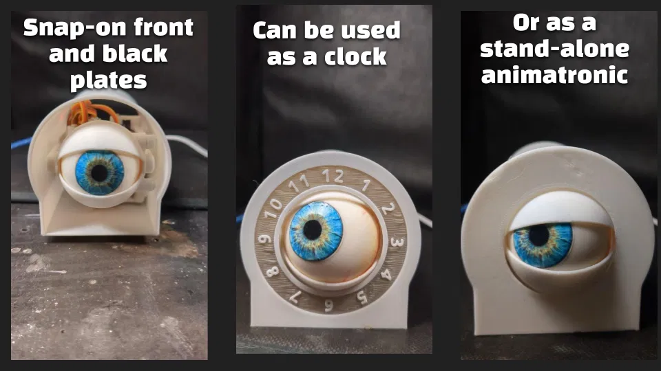 Module mắt animatronic kiêm đồng hồ: cơ cấu mí và eyeball chuyển động bằng 4 micro servo, Arduino Nano + RTC DS3231, driver PCA9685. Thiết kế in PLA, lắp chủ yếu bằng ốc M3; bản v5 dễ lắp và dùng USB-C.