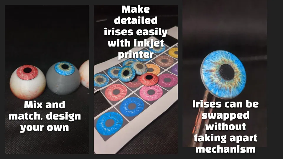 Mình khuyên dán (glue) iris vô eyeball. Nếu bạn muốn thay iris được, luồn một sợi thun nhỏ lên trục dọc (vert-axis). Sau khi lắp xong con mắt, móc sợi thun này qua cái ngàm ở mặt sau của iris. (Có thể bạn sẽ cần cây kẽm hoặc dụng cụ nhọn nhỏ để móc và luồn cho dễ). Cảnh báo: sợi thun này có thể bị kẹt vô phần cơ bên trong, khiến setup kém ổn định hơn.