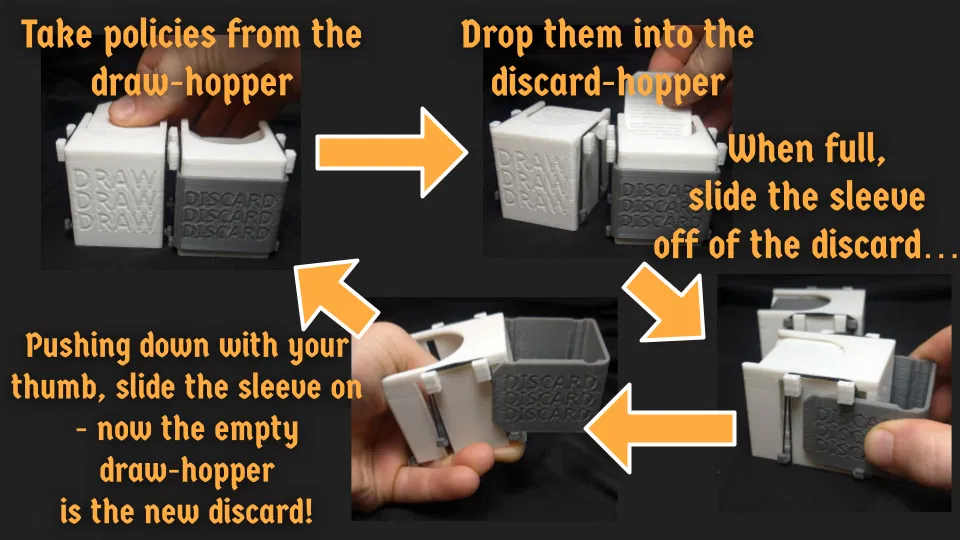 Cách lắp badge: chỉ cần in phần top, bottom và sleeve. Luồn một đoạn filament thường (PLA 1.75mm) qua khớp bản lề; tới đầu kia thì cắt gọn lại. Thường nó sẽ tự giữ đúng chỗ, nhưng nếu chưa chắc thì chấm một chút superglue ở đầu (hoặc hai đầu) sẽ giúp. Để ý chiều gập của badge và cách nó trượt vào sleeve. Sau đó, dán hình chân dung danh tính (identity portrait) ở mặt trong của thẻ, và thông tin phe (party membership) ở mặt ngoài. Khi cho vào sleeve thì nó sẽ bị che kín hoàn toàn (sleeve được làm dày hơn và có chi tiết để hỗ trợ vụ này, nhưng bạn có thể muốn in bằng filament màu tối hơn để khó nhìn xuyên hơn). Nếu ai đó đem soi lên bóng đèn thì chắc nó vẫn sẽ hơi trong, nên... đừng cho người ta làm vậy nha, haha)