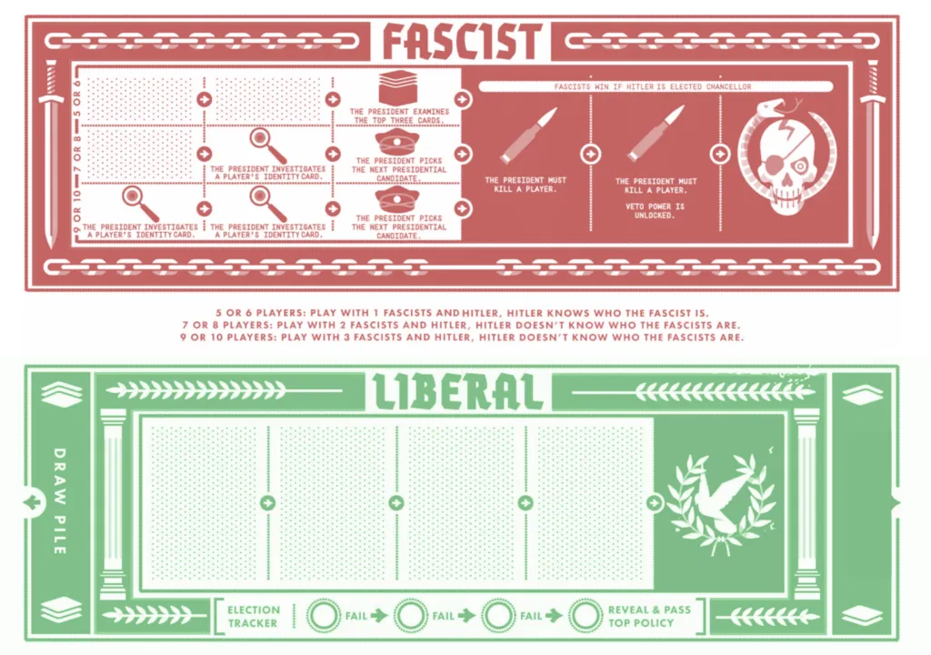 Mình làm phiên bản Secret Hitler kiểu print and play của riêng mình! Đây là một game social deduction cực hay cho 5+ người chơi. Kiểu như một bước “tiến hoá” từ Werewolf/Mafia, với mấy khoảnh khắc vừa hài vừa căng thẳng, đầy phản bội.