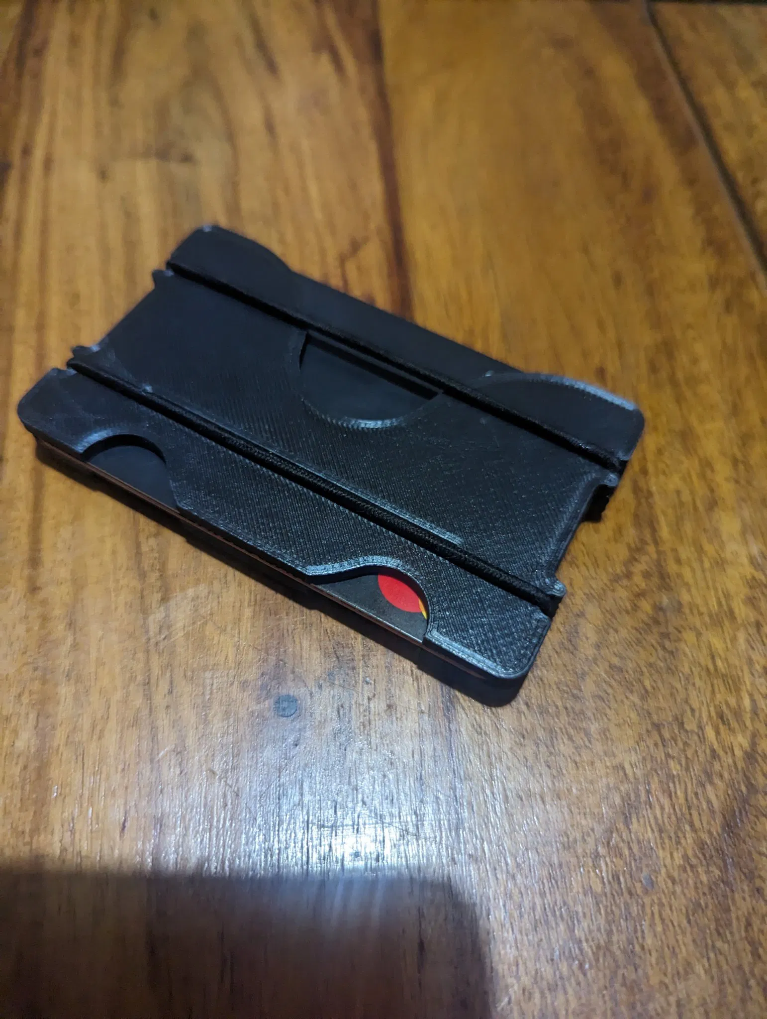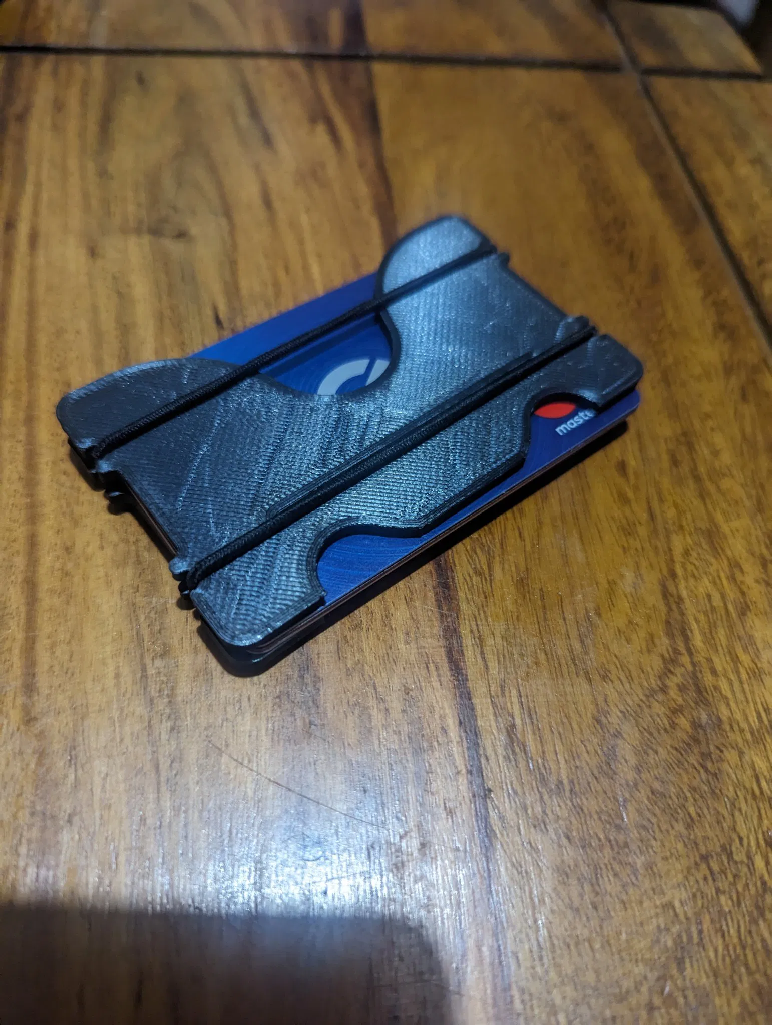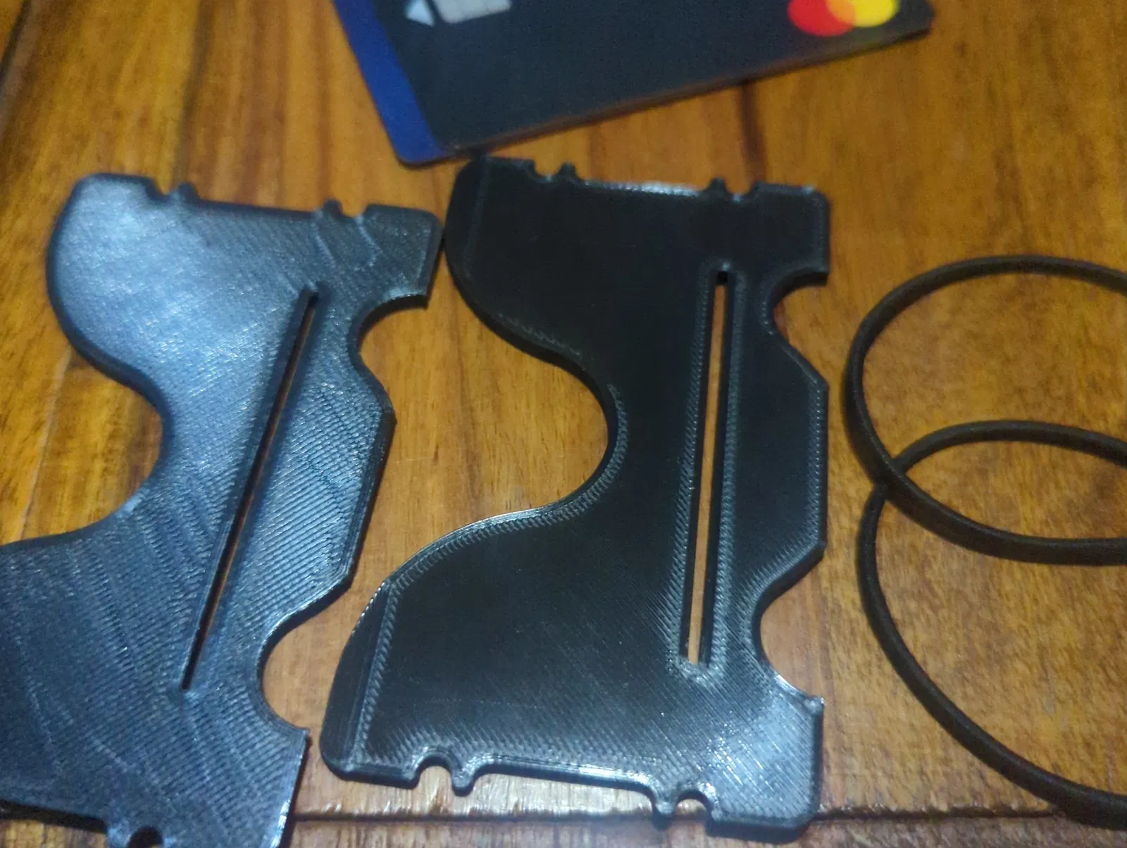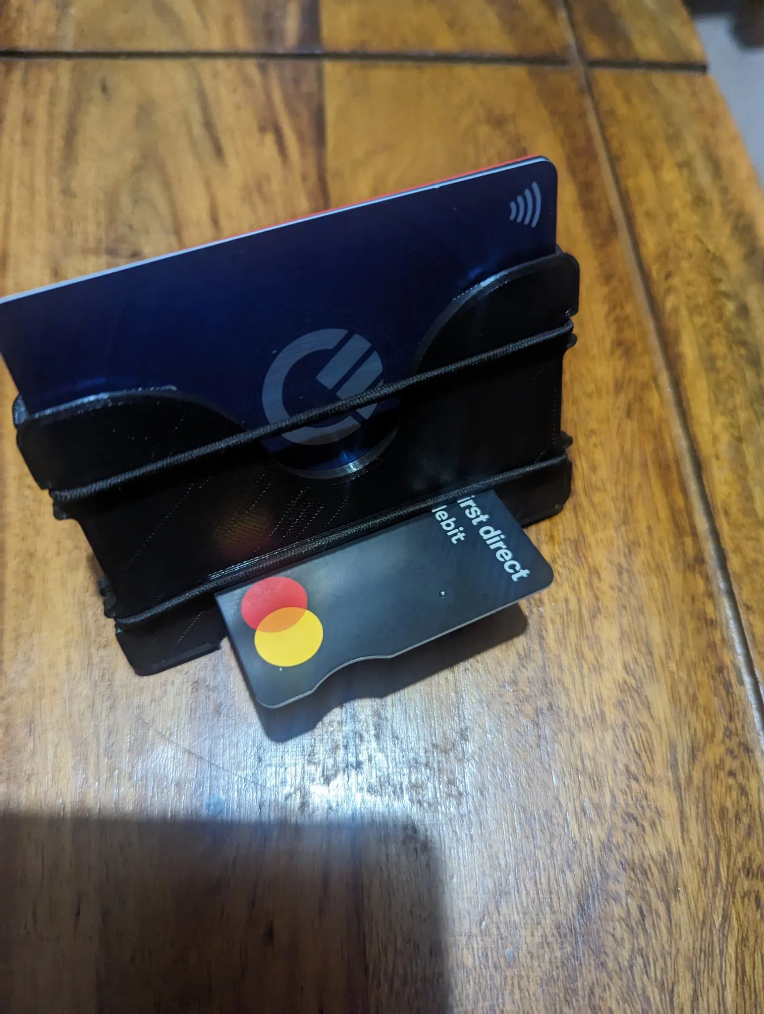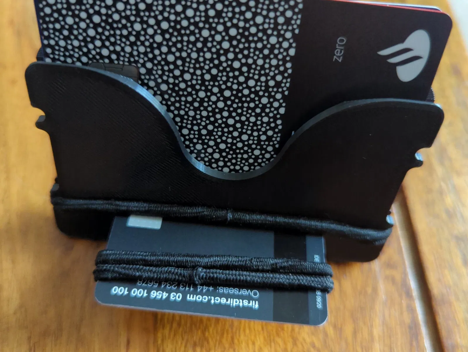 Một chiếc ví thẻ phong cách tối giản sử dụng dây buộc tóc hoặc dây thun để giữ hai tấm lại với nhau. Nhiều thẻ có thể được giữ bên trong.