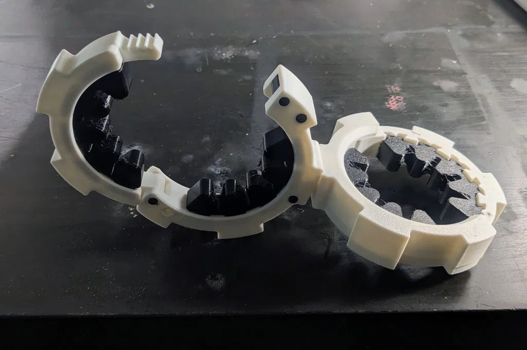 Mẫu còng tay kiểu Star Wars Binders không dùng nam châm, dùng insert TPU mềm để tỳ lên cổ tay. Cần vít M3x20mm. Có cơ chế ratchet, thiết kế parametric để tùy chỉnh size/cuff dày và có link OnShape.
