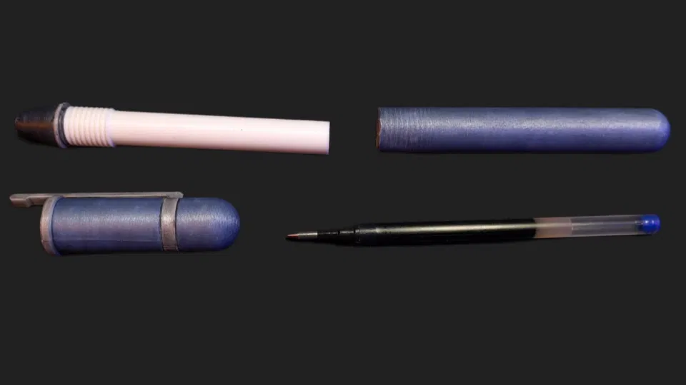 Mẫu bút bo tròn kiểu bullet/space lấy cảm hứng từ Blue Oblong Pen trong Disco Elysium. Thiết kế để gắn ruột mực Pilot G2 (và có thể hợp ruột khác); không cần in ruột mực, chỉ để so kích thước.