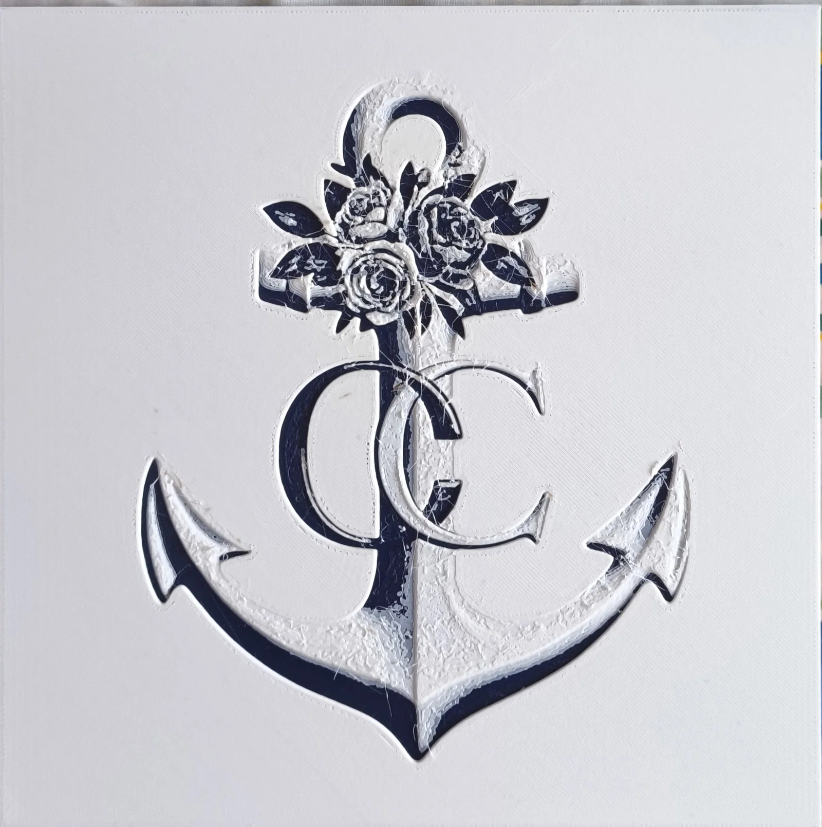 Hueforge nhỏ (dự án 3MF) của một logo mỏ neo kèm hoa hồng.