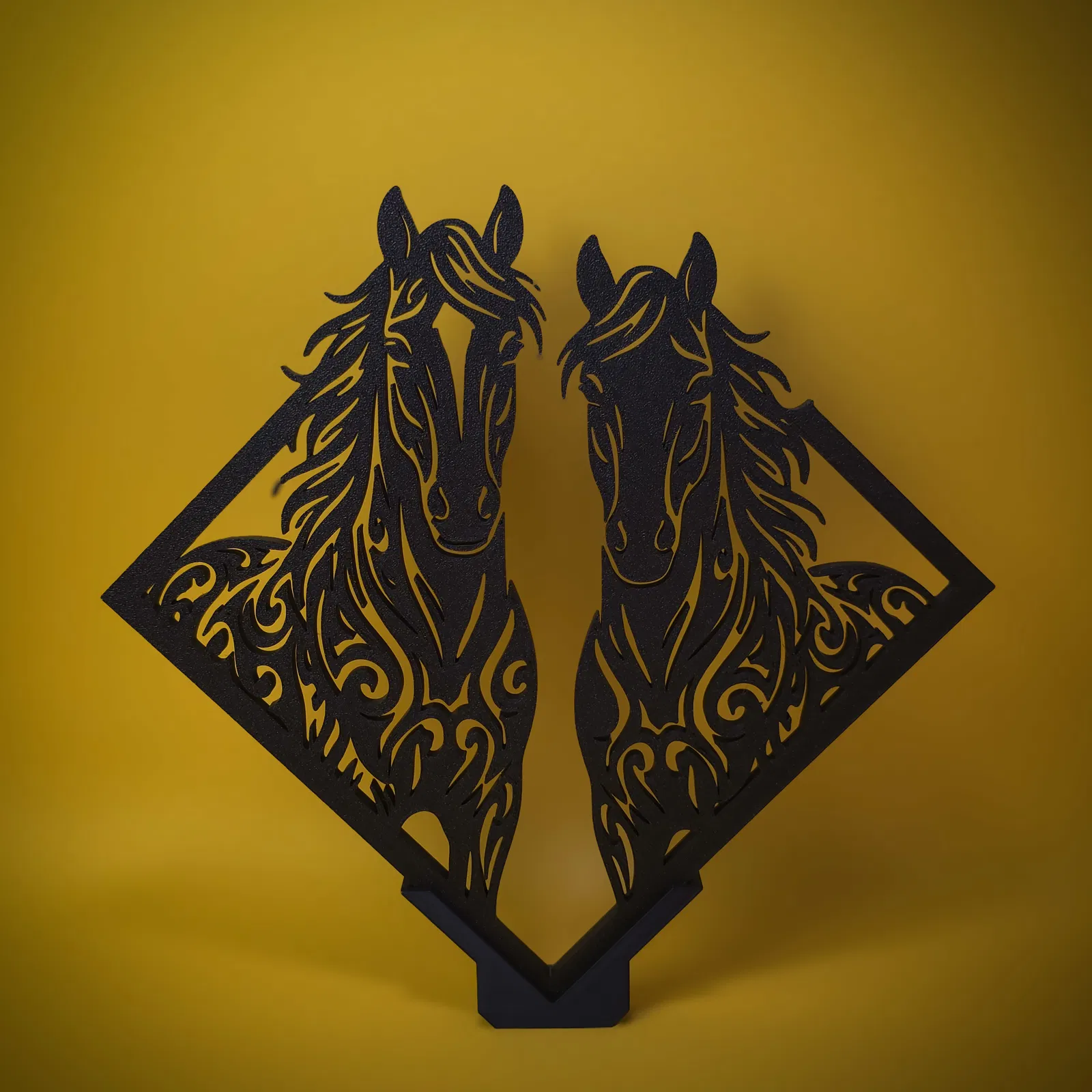 Horses Wall Art – Freestanding Decor là một mẫu decor 2 trong 1: vừa có thể treo tường như wall art, vừa có thể trưng bày dạng tượng đứng với phần chân đế đi kèm. Thiết kế là silhouette con nai màu đen với họa tiết xoáy kiểu tribal và chi tiết filigree mảnh, tạo độ tương phản mạnh và hiệu ứng bóng đổ có chiều sâu. Tối ưu cho in một màu sắc sạch đẹp, với hình học cutout tinh xảo. Thuộc series decor biểu tượng Spirit in Silhouette.