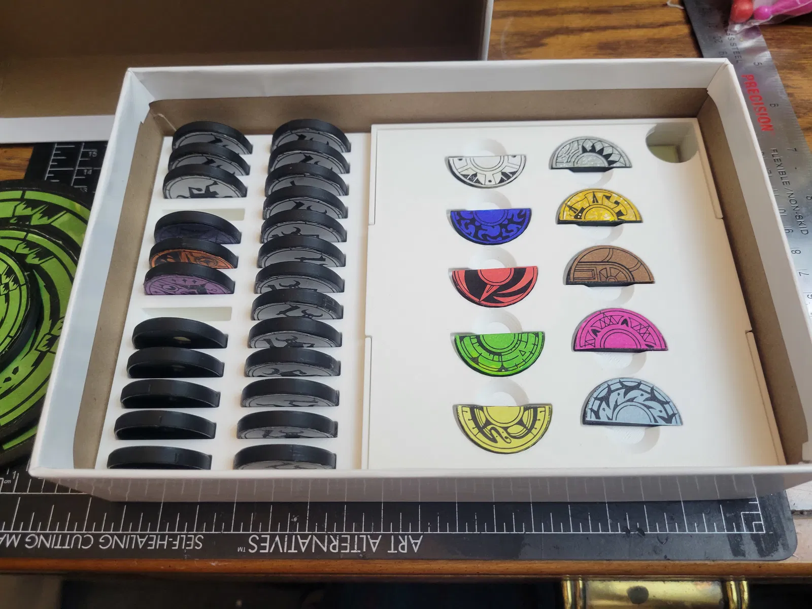 Token quái (monster tokens) thì đơn giản: một cái đĩa trơn, vát mép (chamfer) nhẹ ở mặt dưới để dễ bốc lên, và bo tròn (roundover) nhẹ ở mặt trên để cầm cho sướng tay. Token người chơi (player tokens) cũng cùng form đó, nhưng vì nhân vật trong Prequel được tạo bằng cách kết hợp hai archetype, nên mình làm thêm bộ “nửa miếng” dạng nửa hình tròn mỏng hơn để dán icon của các archetype lên. Bản thân player token giống monster token, nhưng có khoét một phần lõm tương ứng để bạn press-fit hai miếng nửa này vào, tạo ra token riêng cho từng người chơi.