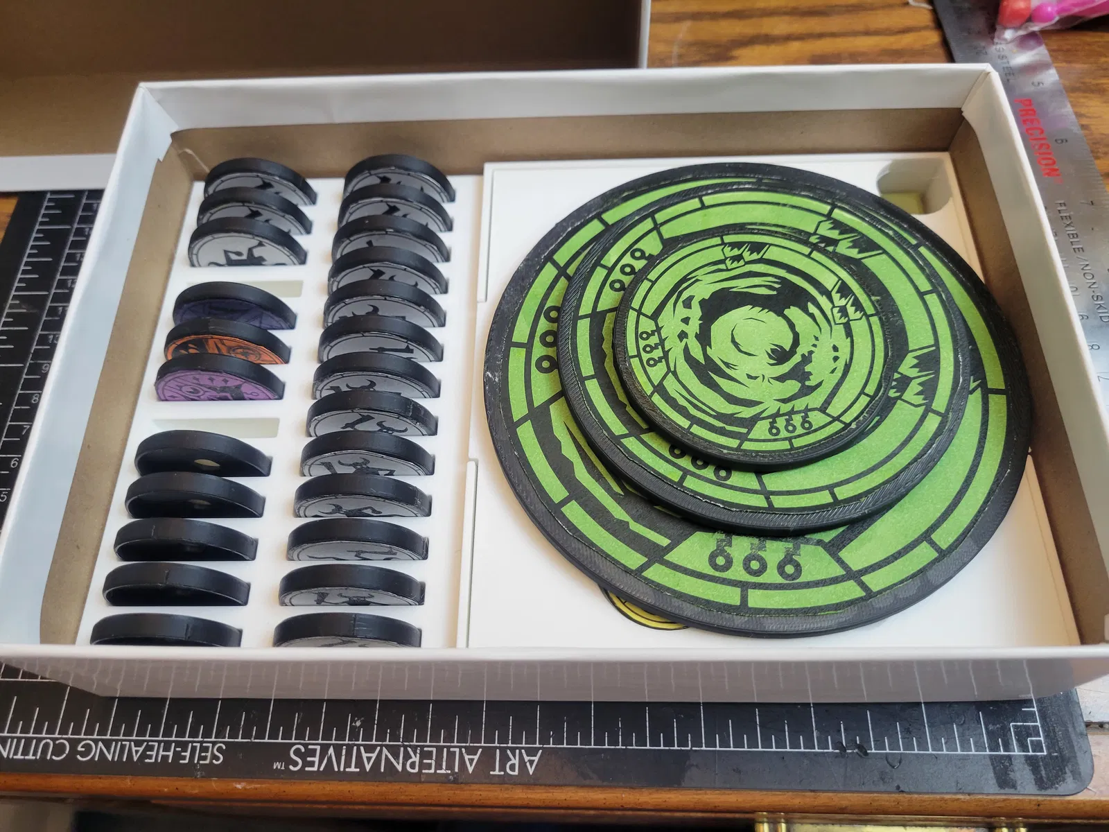 • Và nói về Cataclysm: nó có thể lớn hơn 4x4; mình không làm token 5x5 hay 6x6 vì chúng sẽ lớn hơn cái hộp—với lại Cataclysm lên 6x6 là kết thúc game ngay, nên có lẽ cũng không đáng làm token riêng. Mình có thử nghĩ vài giải pháp 5x5 kiểu token ghép nhiều mảnh “bấm” lại với nhau, nhưng cảm giác không tinh tế, và đây là một ngách khá hẹp trong game nên mình thấy không đáng theo đuổi, so với việc cứ dùng token 4x4 rồi, ví dụ, đặt một tờ giấy 5x5 to bên dưới để chỉ vùng nó đang chiếm. Chuyện này cũng quay lại vấn đề grid—nếu mình tìm được cách khác để Cataclysm “phình” lên mà vẫn nhìn ngầu, thì có thể giải phóng chỗ hiện tại của mấy token cỡ lớn để dùng cho grid gập 4.