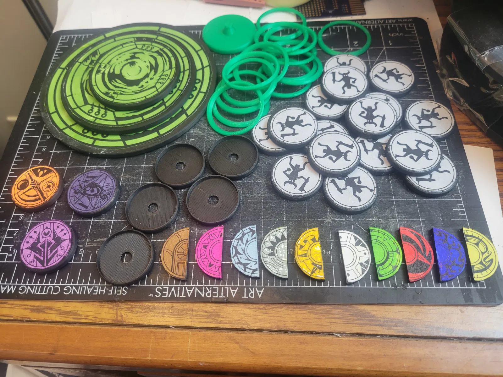 Token marks là một thành phần tương đối đơn giản khác. Tùy loại Evil bạn đối mặt, chúng có công dụng khác nhau—đôi khi để đánh dấu ô trên battle grid, đôi khi gắn vào token như kiểu “cursed haloes”. Nên mình thiết kế chúng dạng vòng (ring) lớn hơn token một chút, để có thể đặt bao quanh token, hoặc đặt lên một ô lưới để token vẫn đi xuyên qua tự do. Các góc cạnh lạ ở hai bên vòng là cách mình cố cân bằng giữa “dễ nhấc token mà không nhấc luôn mark” và “dễ nhấc cả token lẫn mark cùng lúc”, để hợp với các cách dùng khác nhau.