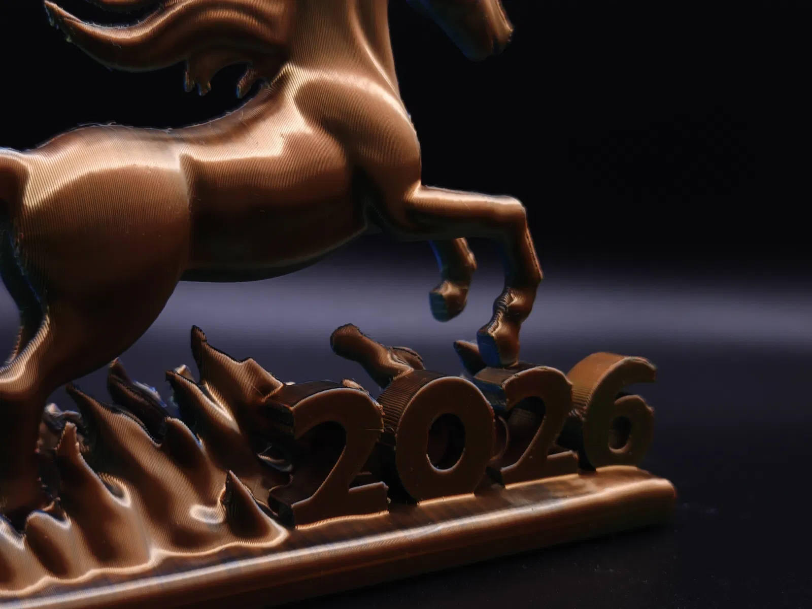 Tượng 3D Flame Horse 2026 với dáng ngựa vươn lên giữa lửa cách điệu, đế có số “2026”. Tối ưu để in dựng đứng hạn chế support; đẹp nhất khi dùng filament dual-color hoặc silk cho hiệu ứng ánh kim nổi bật.