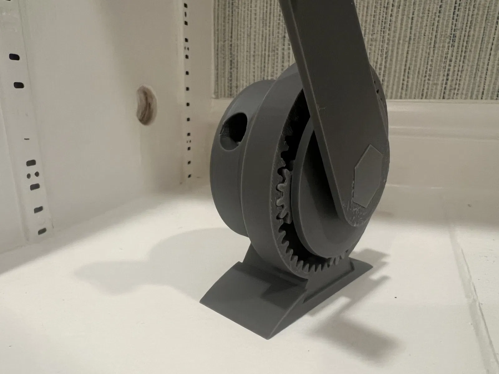 Mẫu Hand Crank Impeller Pump dùng tay quay và planetary gears để kéo impeller mềm. In bánh răng, impeller và bearing cover bằng TPU, các phần còn lại bằng PLA. Cần pause máy để đặt impeller vào rồi resume.