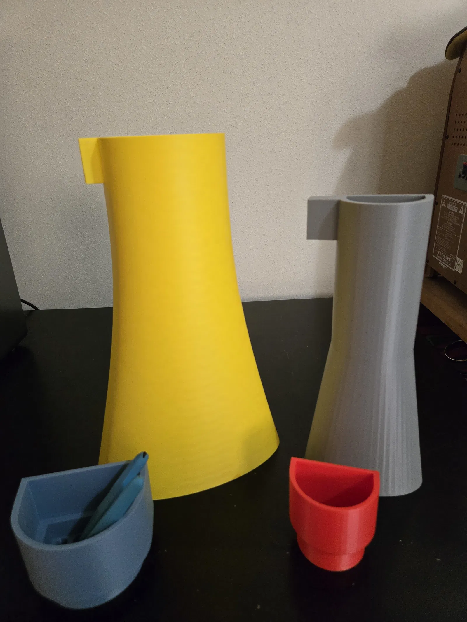Phần chute có thể cần hoặc không cần support cho cái mép trên cùng, nhưng bản của mình in lên ổn luôn không cần support hay brim; phần đáy được vát góc nên hoàn toàn không cần support. Còn cái cốc/khay thì cần support cho phần viền.