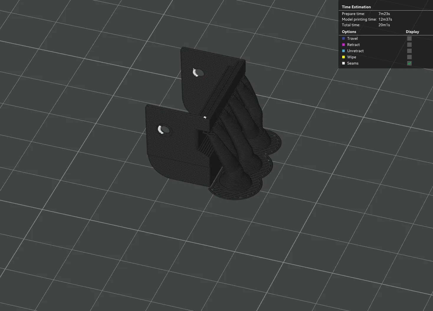 Mình khuyên nên in mẫu này kèm support ở những chỗ các đường in đi xuống rồi đi lên. Mình sẽ up một tấm hình.