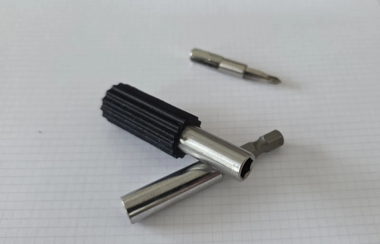Ai cũng có ít nhất một cái Magnetic bit holder dư nằm trong lon cà phê “để đó lỡ cần” chung với đủ thứ linh tinh. Với cái tay cầm này, bạn biến cái holder dư đó thành một cây tua vít mini, in rất dễ.