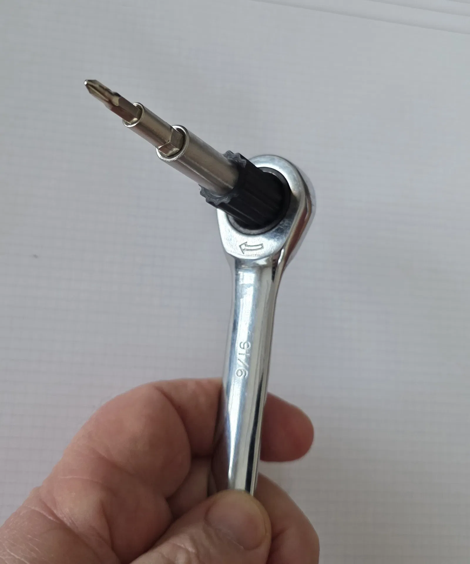 In bằng TPU dẻo, tay cầm được ép chặt (press fit) lên bit holder để thành báng cầm cố định. Rất hợp để vặn các món nhỏ. Tay cầm bám tay rất tốt, nhưng nếu cần thêm lực (torque) thì có thể gắn vừa với đầu tuýp 9/16 SAE hoặc 14mm, hay dùng cờ-lê.