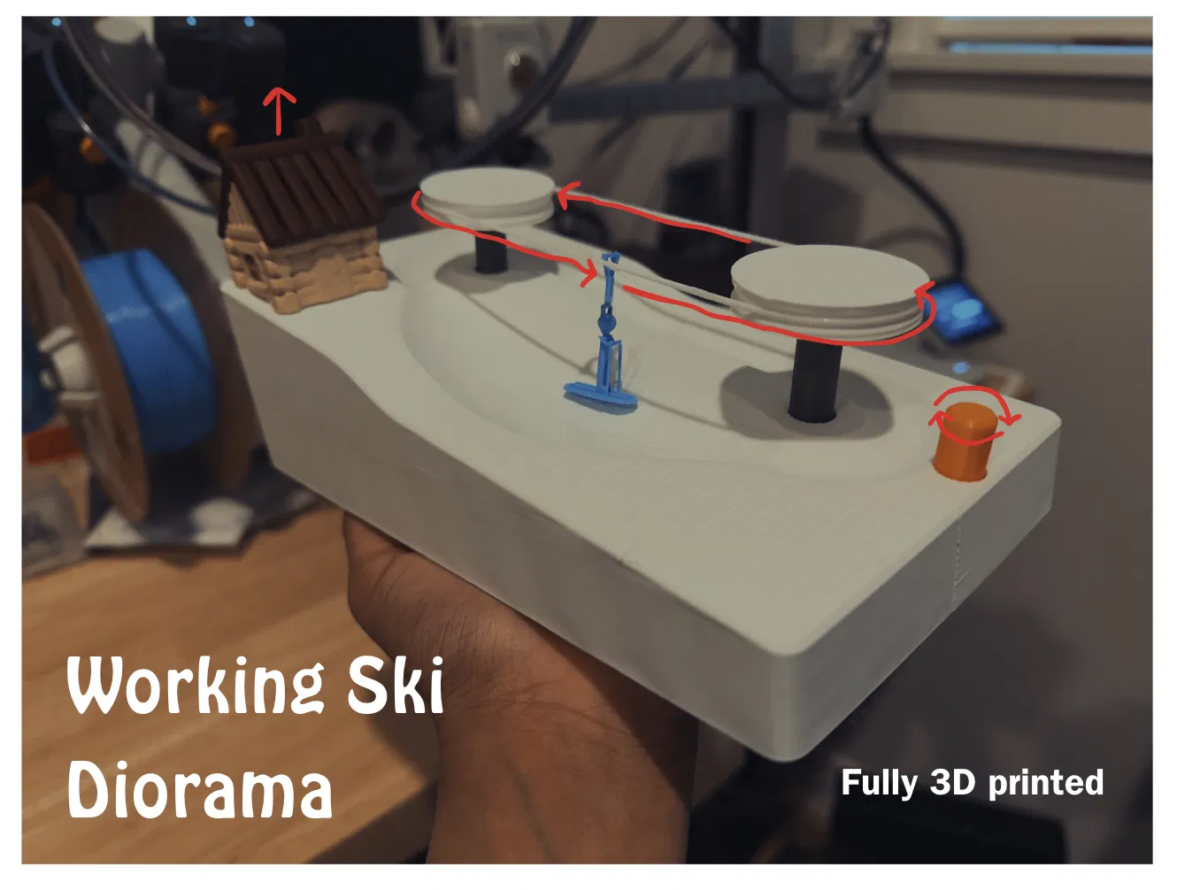 Working Ski Diorama là mô hình diorama trượt tuyết có cơ chế hoạt động: vặn núm màu cam để nhân vật màu xanh chạy vòng quanh ski lift. Kèm mẹo lắp bánh răng, pulley và dây TPU để chạy mượt, ít kẹt.