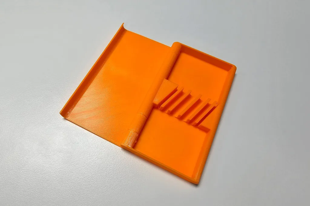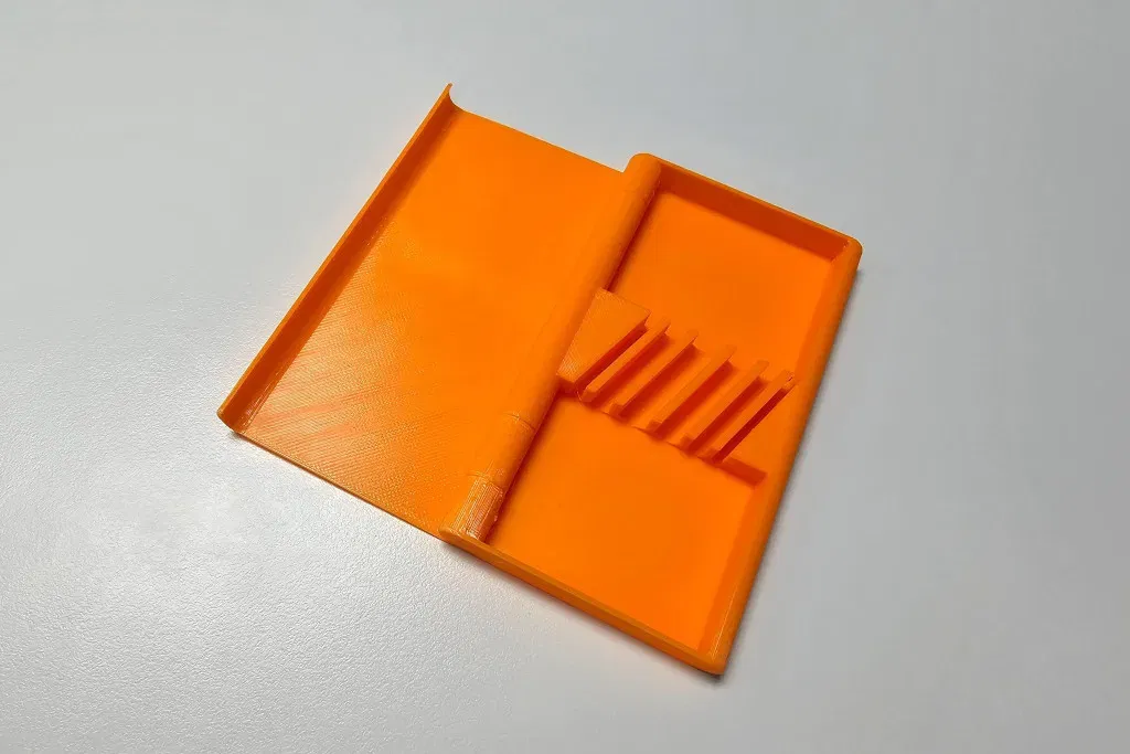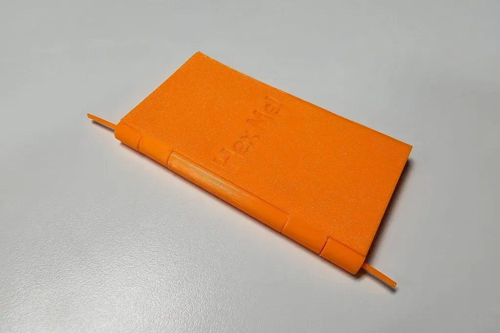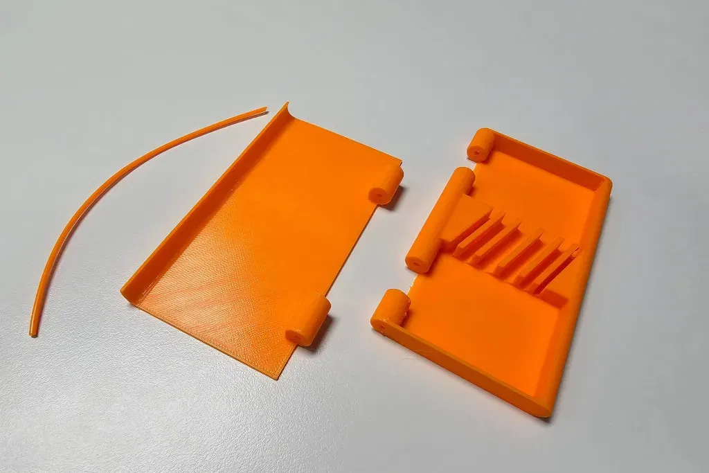 Một chốt bản lề 2mm là cần thiết để lắp ráp phần đế và nắp. Một đoạn filament rất vừa vặn, vì vậy bạn cần cắt một đoạn filament dài 105+ mm và cho nó vào lỗ bản lề. (hình #4) Bạn có thể cần cắt đầu của chúng sắc nhọn ở cả hai hướng, hoặc chỉ cần làm nóng các đầu của chốt với thân hộp.