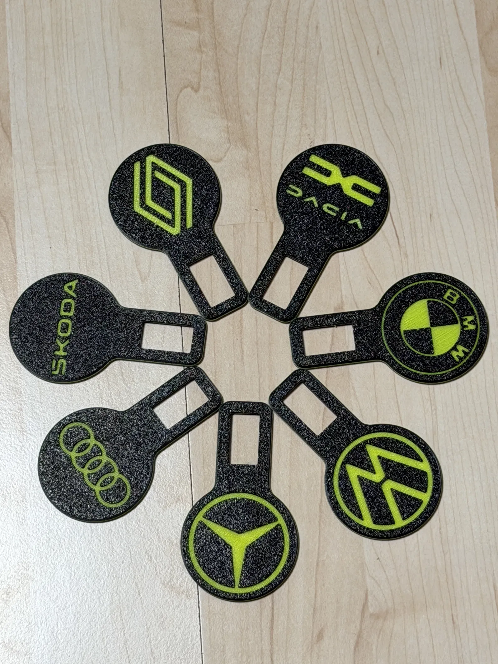 Gurtstecker/seat belt dummy plug có logo cho Audi, BMW, Dacia, Mercedes, Renault, Skoda và VW. Mẫu được in bằng PETG với chiều cao layer 0.2 mm.