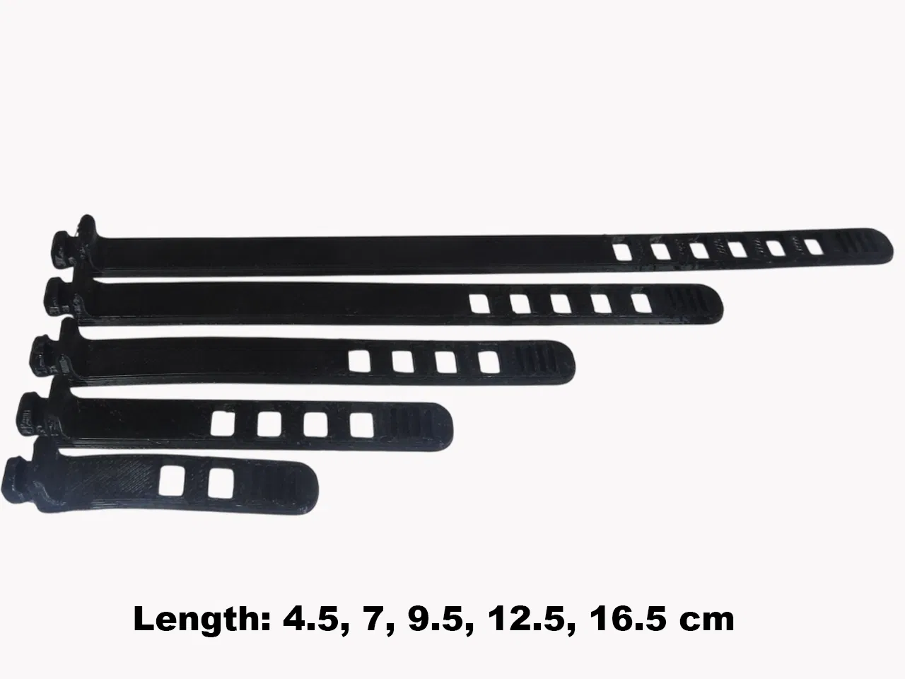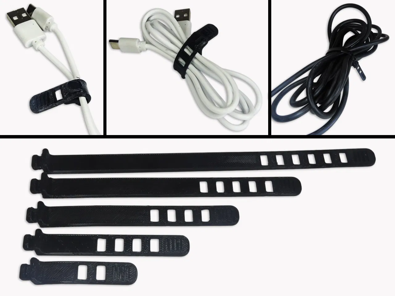 Bộ dây rút cáp TPU (cable ties) dạng tháo rời, có nhiều chiều dài để chọn. In bằng TPU cho độ dẻo, dễ tháo và tái sử dụng, phù hợp gọn dây điện, dây sạc, cable management.