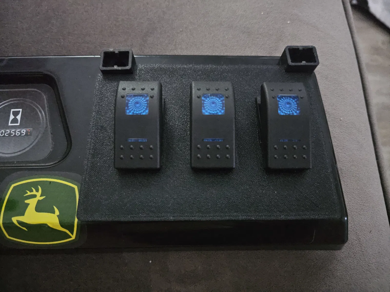 Panel 3 công tắc tuỳ chỉnh để gắn phụ kiện 12V cho đồ chơi John Deere Gator. Cần tháo panel và mài bo góc để vừa. Khuyến nghị in ABS 100% infill, không cần supports; tác giả in trên Sovol Zero ổn.