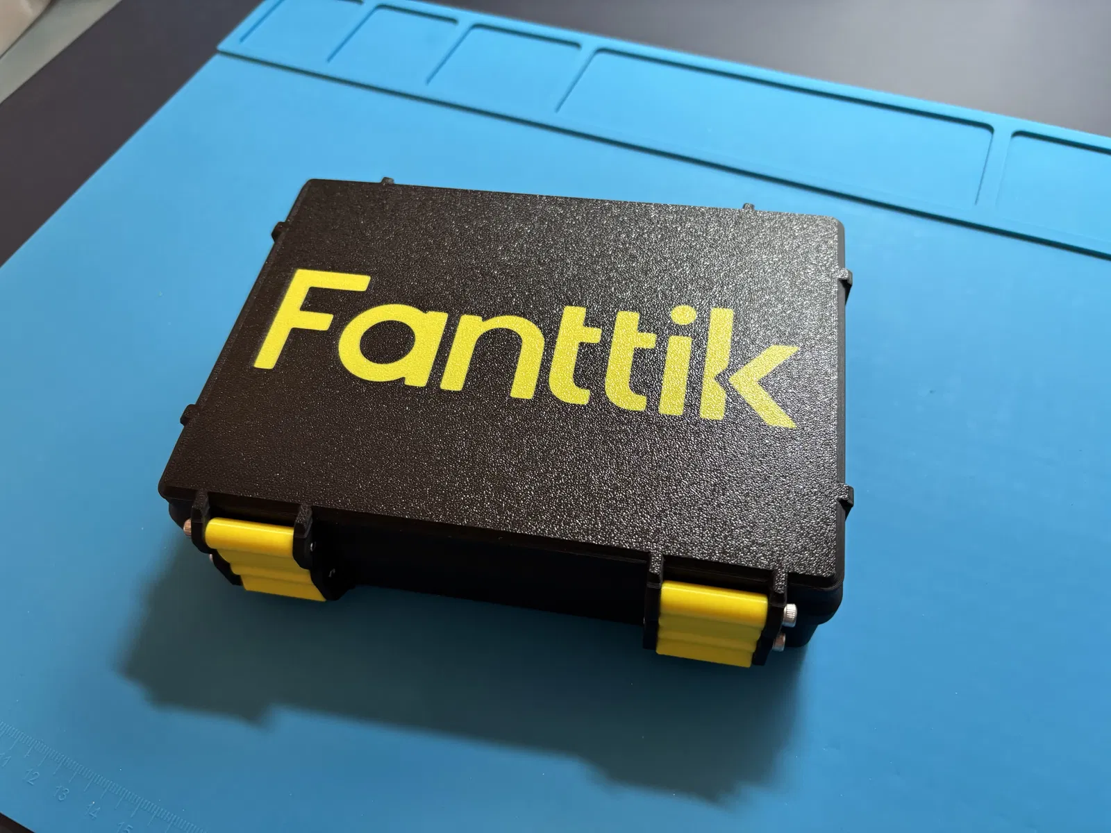 Hộp Rugged với logo Fanttik, phù hợp để sắp xếp đồ nghề. Khi in, nhớ giảm kích thước insert 0,3 mm trong slicer (bật uniform scaling). Lắp ráp bằng 6 ốc M3x30 và thêm miếng foam ~10 mm cho nắp.