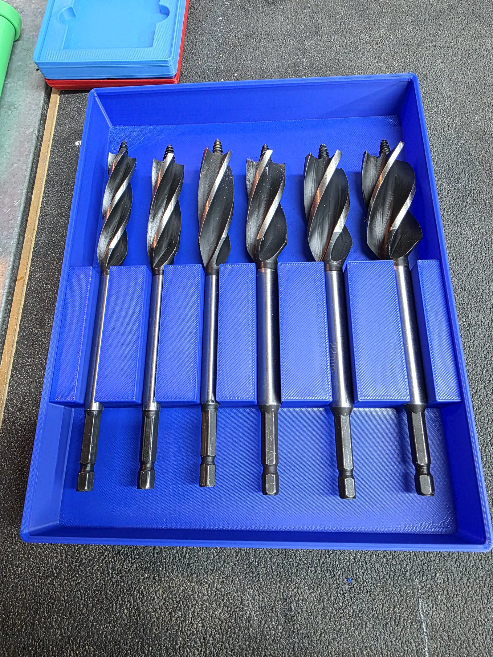 Mẫu Gridfinity dùng để giữ và sắp xếp gọn gàng bộ mũi khoan auger hệ mét (mm). Phù hợp cho ngăn kéo/khay theo chuẩn Gridfinity, giúp dễ lấy và cất mũi khoan.