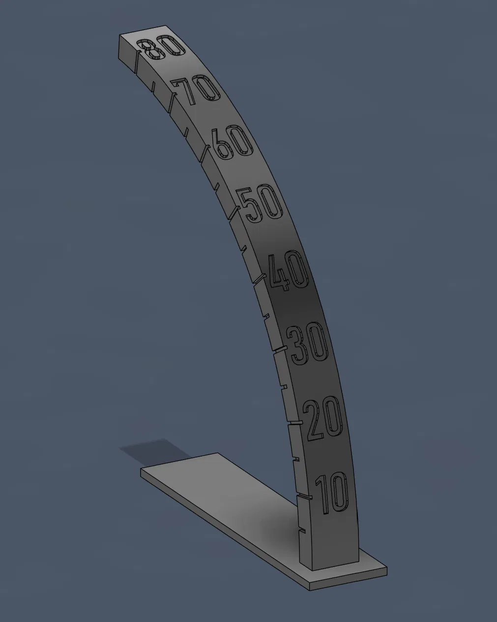 Mẫu “Overhang test model” dùng để kiểm tra khả năng in overhang từ 0 đến 85°, cao khoảng 5 cm. Các mốc góc hiển thị mỗi 10° và có vạch 5° ở bên hông; có thể xoay trong slicer để test theo các hướng X/Y khác nhau.