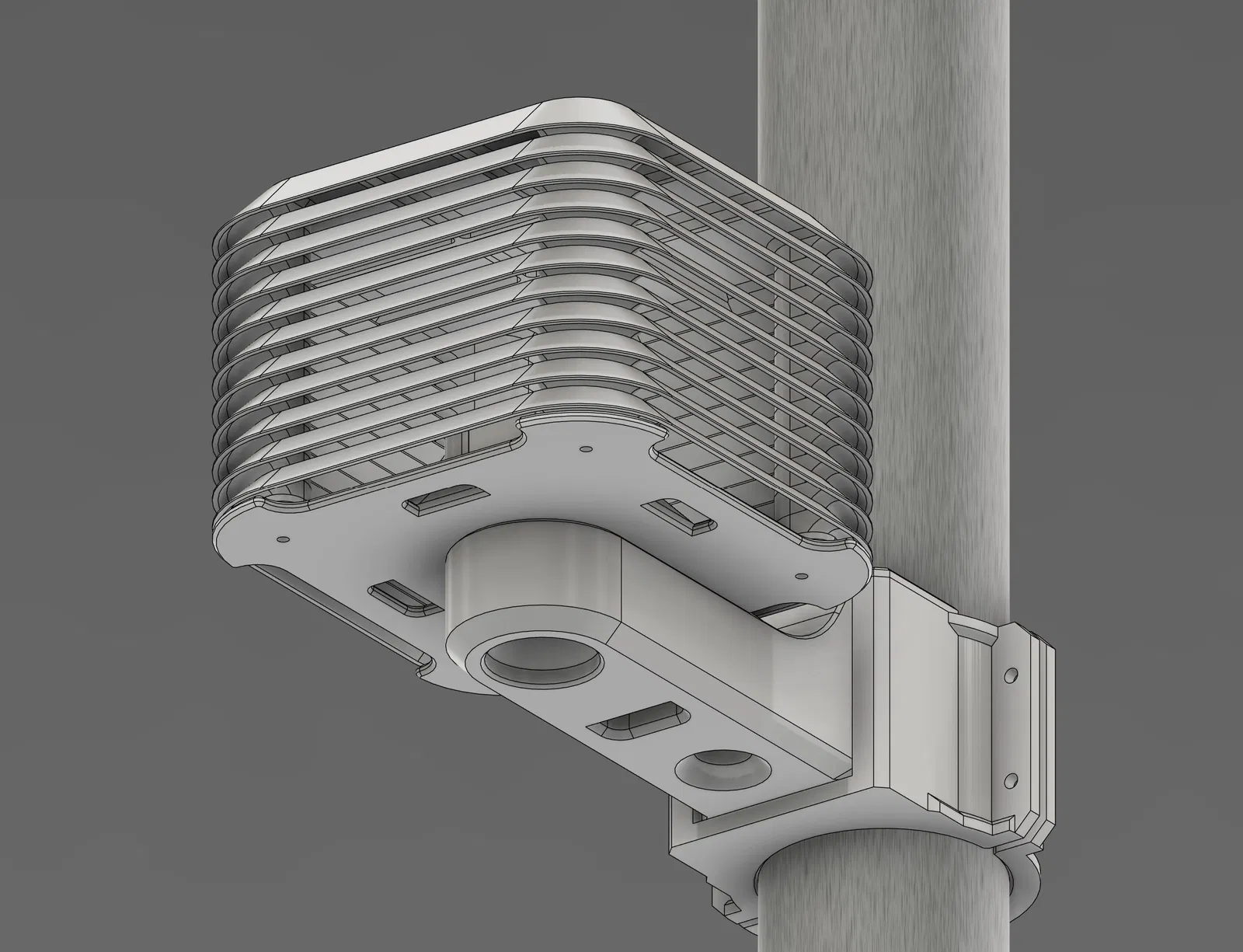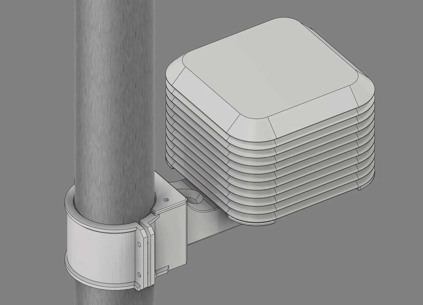 Stevenson screen nhỏ gọn dạng modular cho cảm biến Aqara WSDCGQ11LM. Lắp snap-in không cần ốc/keo, chồng Lamella tùy chỉnh chiều cao, dovetail tháo lắp nhanh; hỗ trợ gắn tường hoặc kẹp ống OD 65 mm.