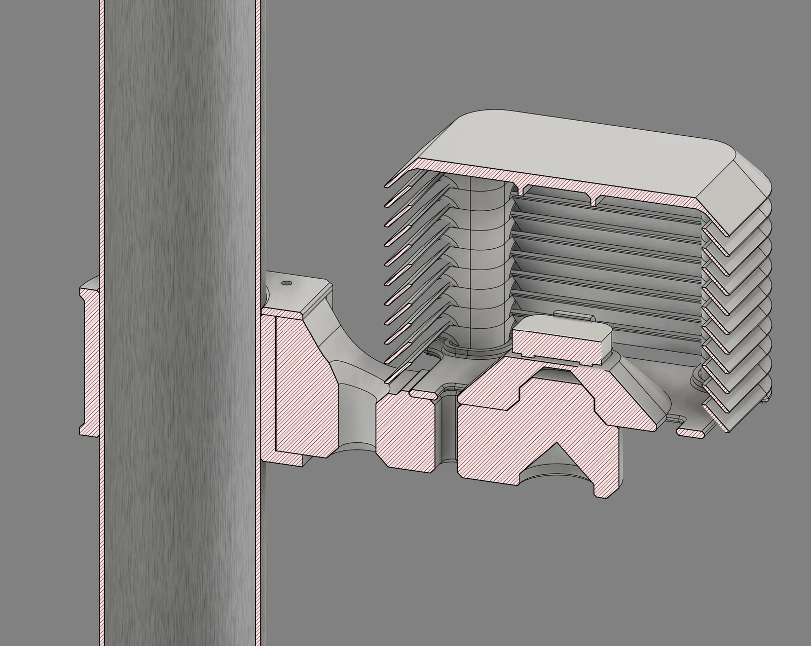 Pipe bracket front — nửa trước của kẹp cho ống OD 65 mm; có ổ dovetail; có 2 lỗ để gắn heat-set inserts M3×5 (dùng cho locking panel tùy chọn).