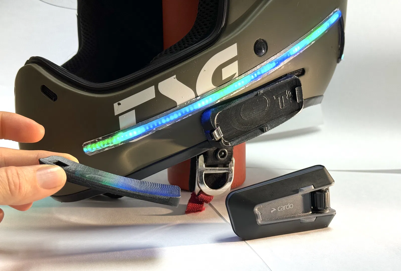 Thiết kế ngàm gắn Cardo Packtalk Neo siêu mỏng giúp nón (như TSG Pass) vẫn gọn đẹp, ít tăng bề ngang. V11 có khe USB‑C phía dưới để tháo Cardo ra mà dây không bị thòng. In theo hướng STL, không cần support.