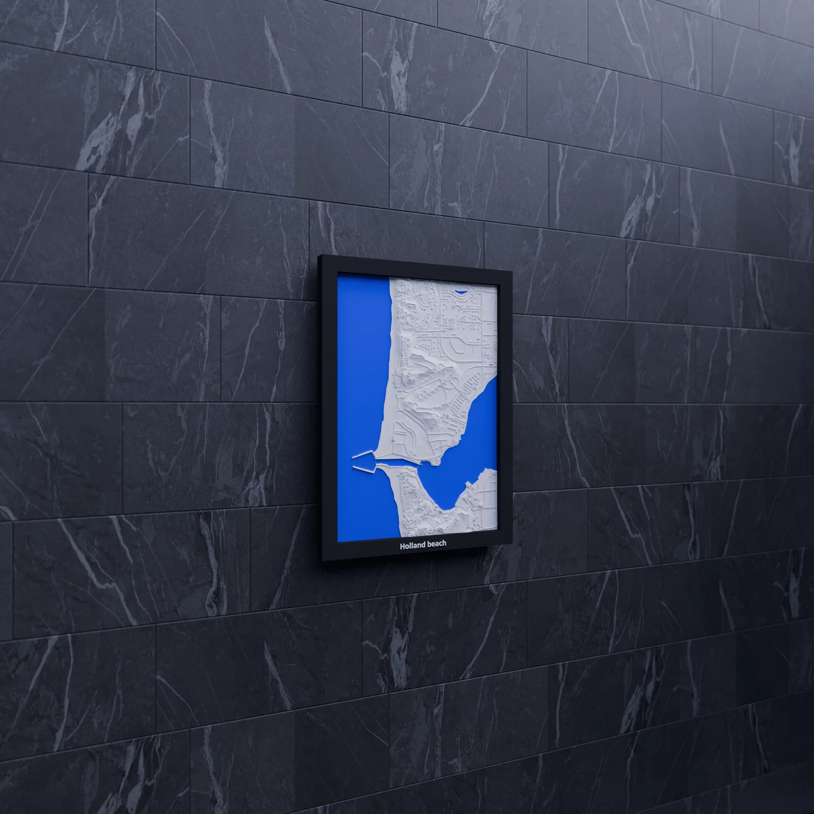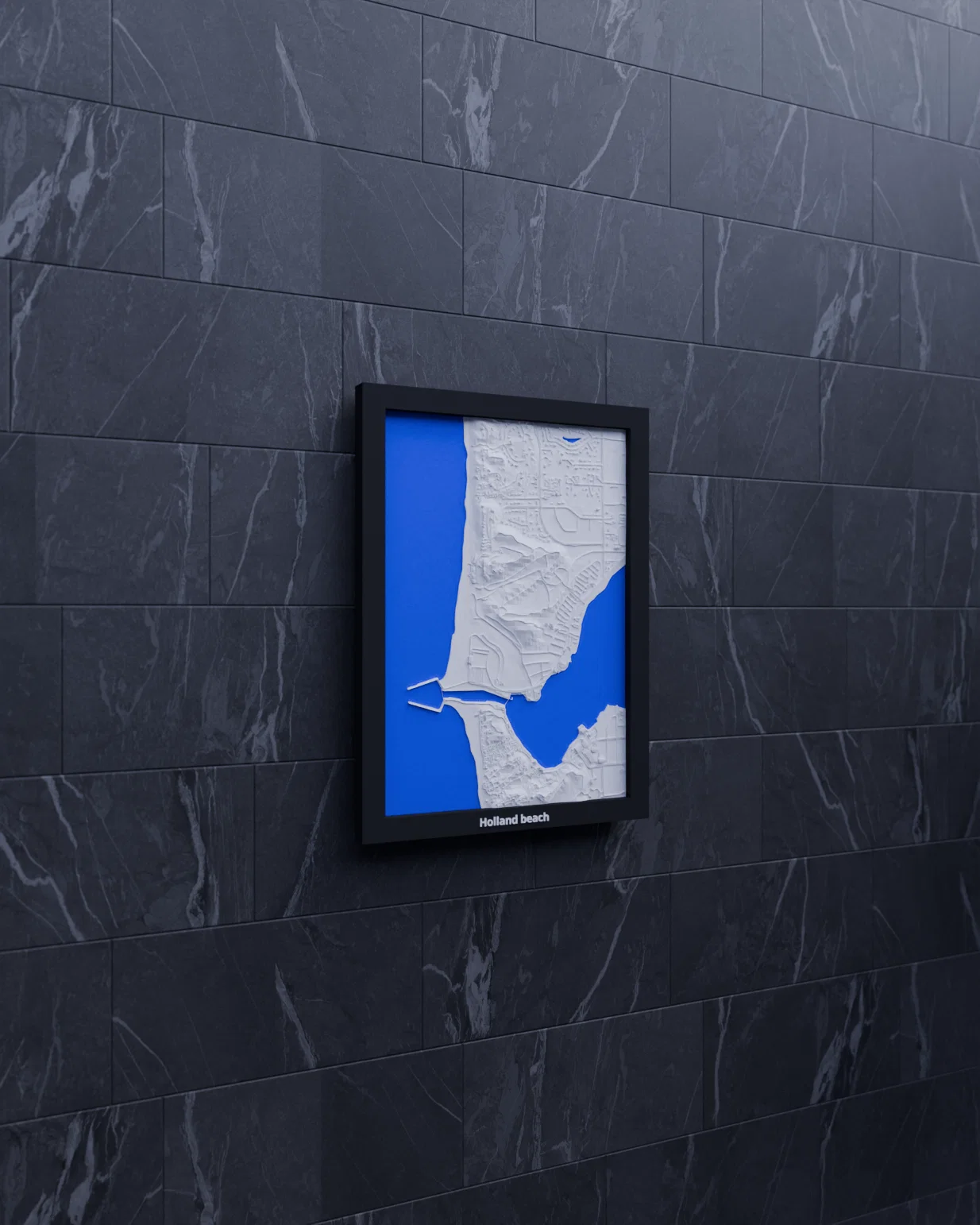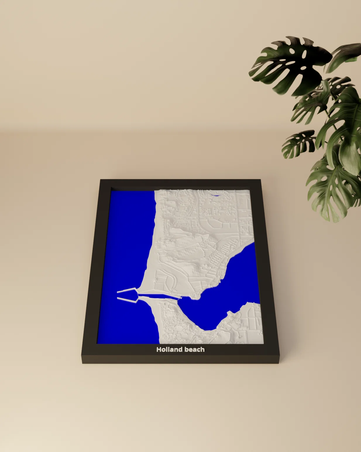 Mô hình thu nhỏ địa hình 3D tái hiện Holland beach (Hoa Kỳ) từ dữ liệu địa lý, thu nhỏ khu vực 1.975 × 2.807 km thành 119.5 × 170.5 mm. Có STL/3MF, nhiều khung treo, kèm profile in tối ưu.