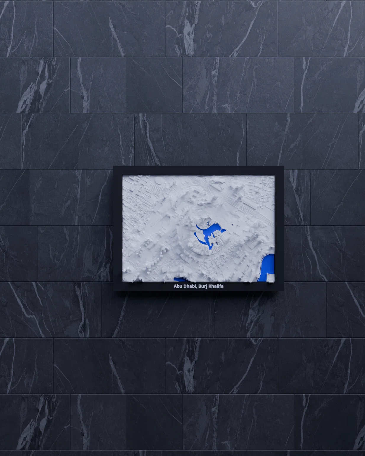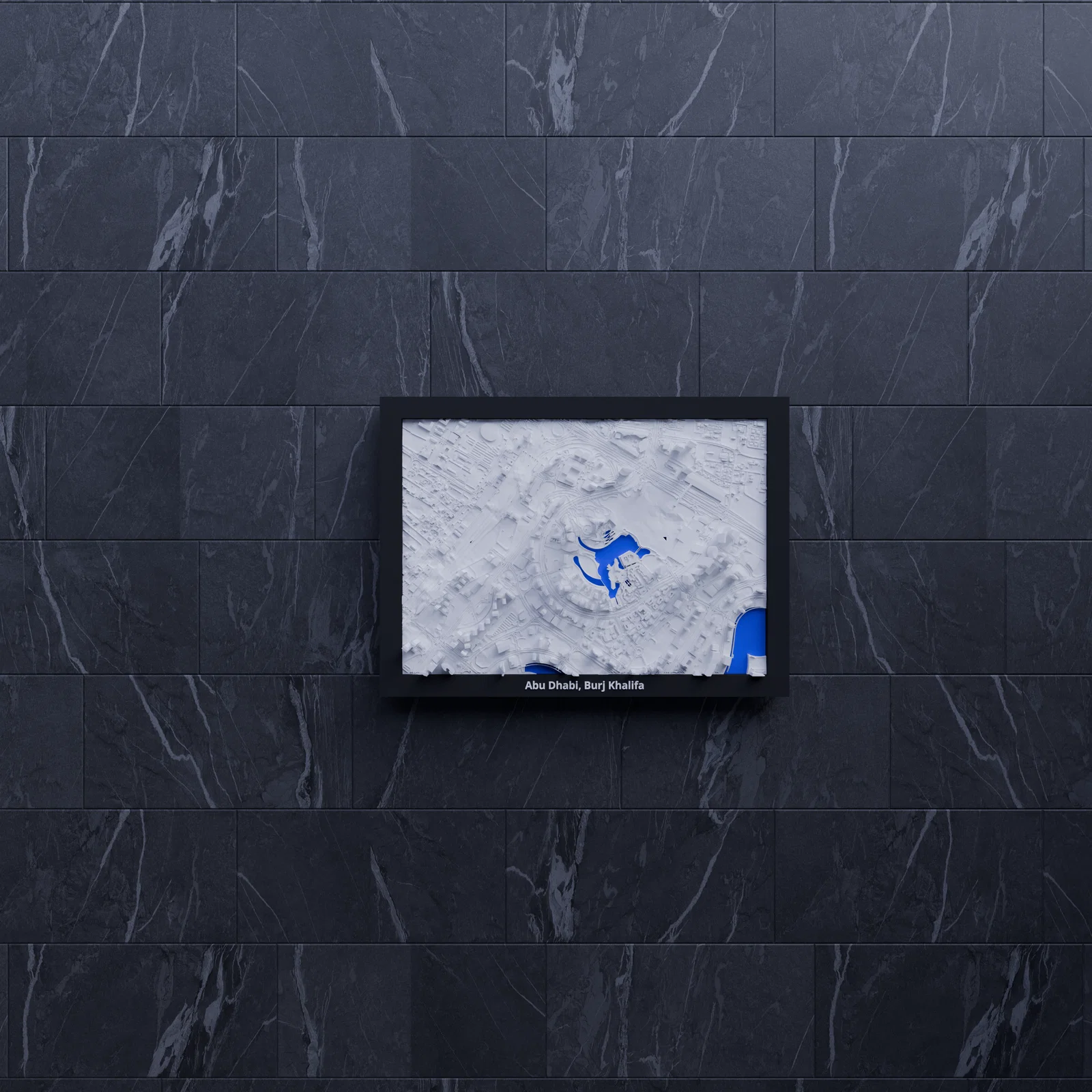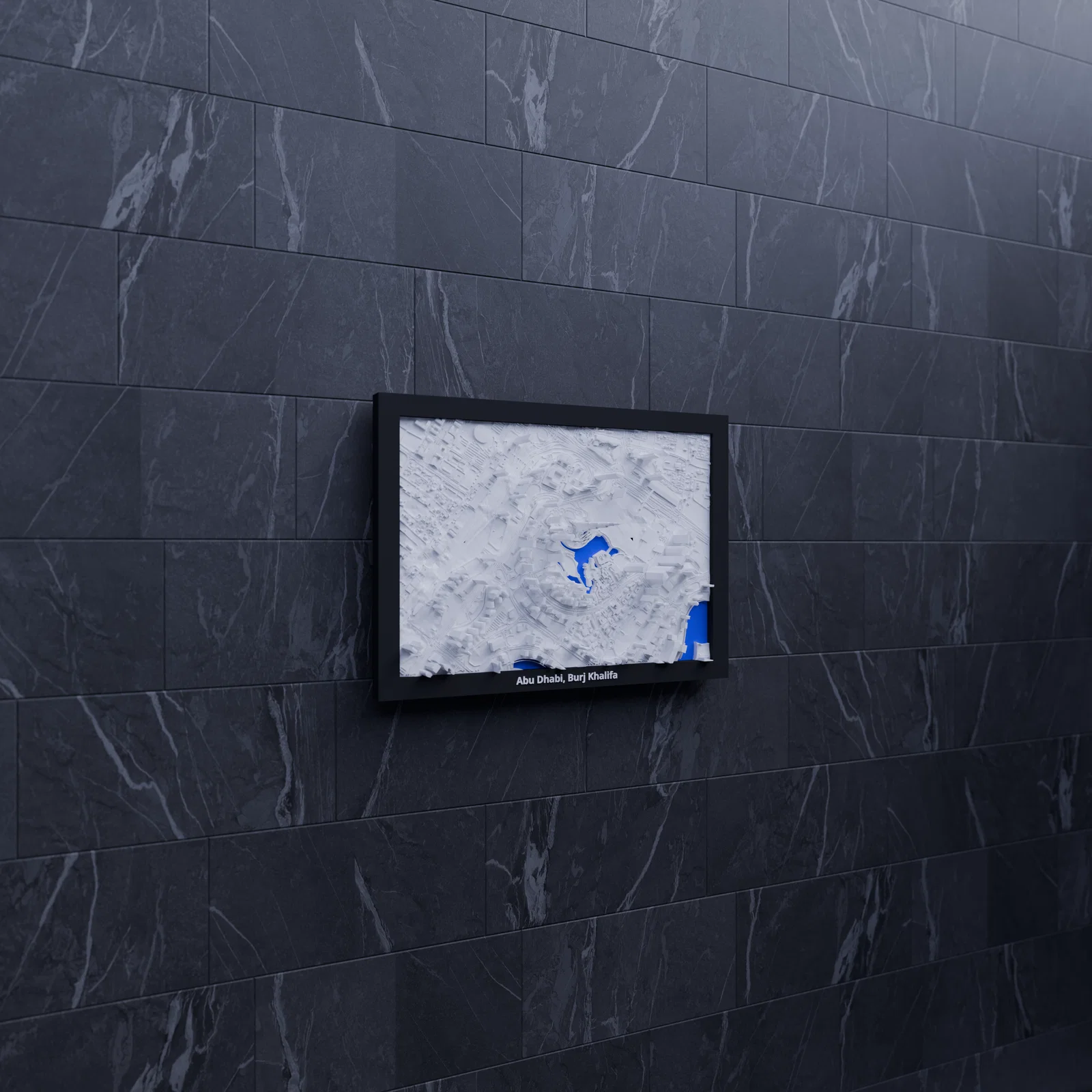 Mô hình địa hình thu nhỏ in 3D tái hiện khu vực Abu Dhabi, Burj Khalifa theo dữ liệu địa lý, tỷ lệ ~16511:1 (170.5 × 119.5 mm). Đi kèm STL/3MF và nhiều phiên bản frame có lỗ treo.