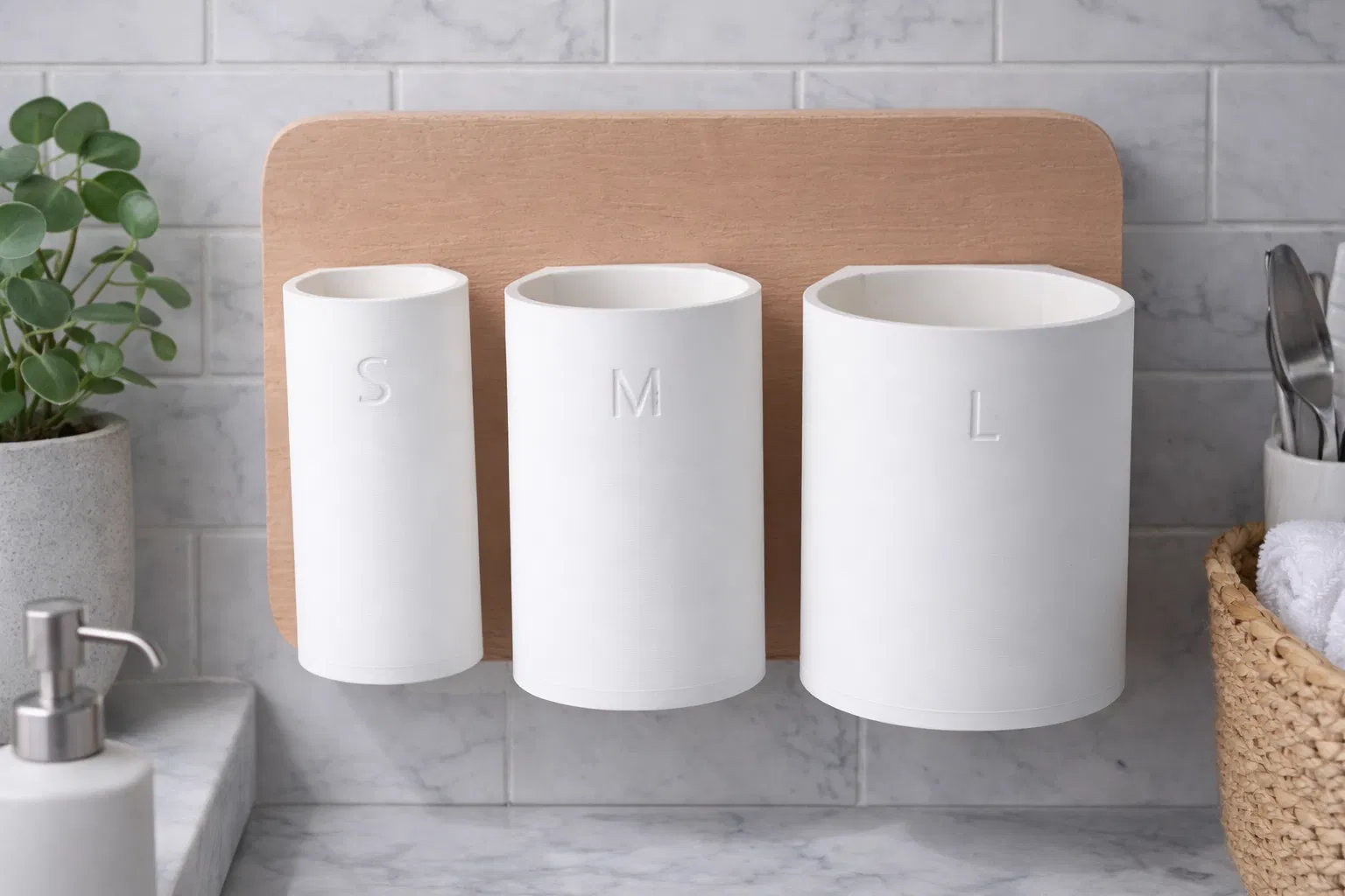 Thiết kế tối giản nhìn rất sạch sẽ khi đặt trên kệ hoặc để trong ngăn kéo. Chữ kích cỡ được dập nổi giúp phân biệt các cuộn chỉ liếc một cái là thấy (small, medium, large). In 3D bằng nhựa bề mặt matte, sờ mịn, bền, và lau chùi cực dễ — quá hợp cho việc bếp núc dùng hằng ngày.