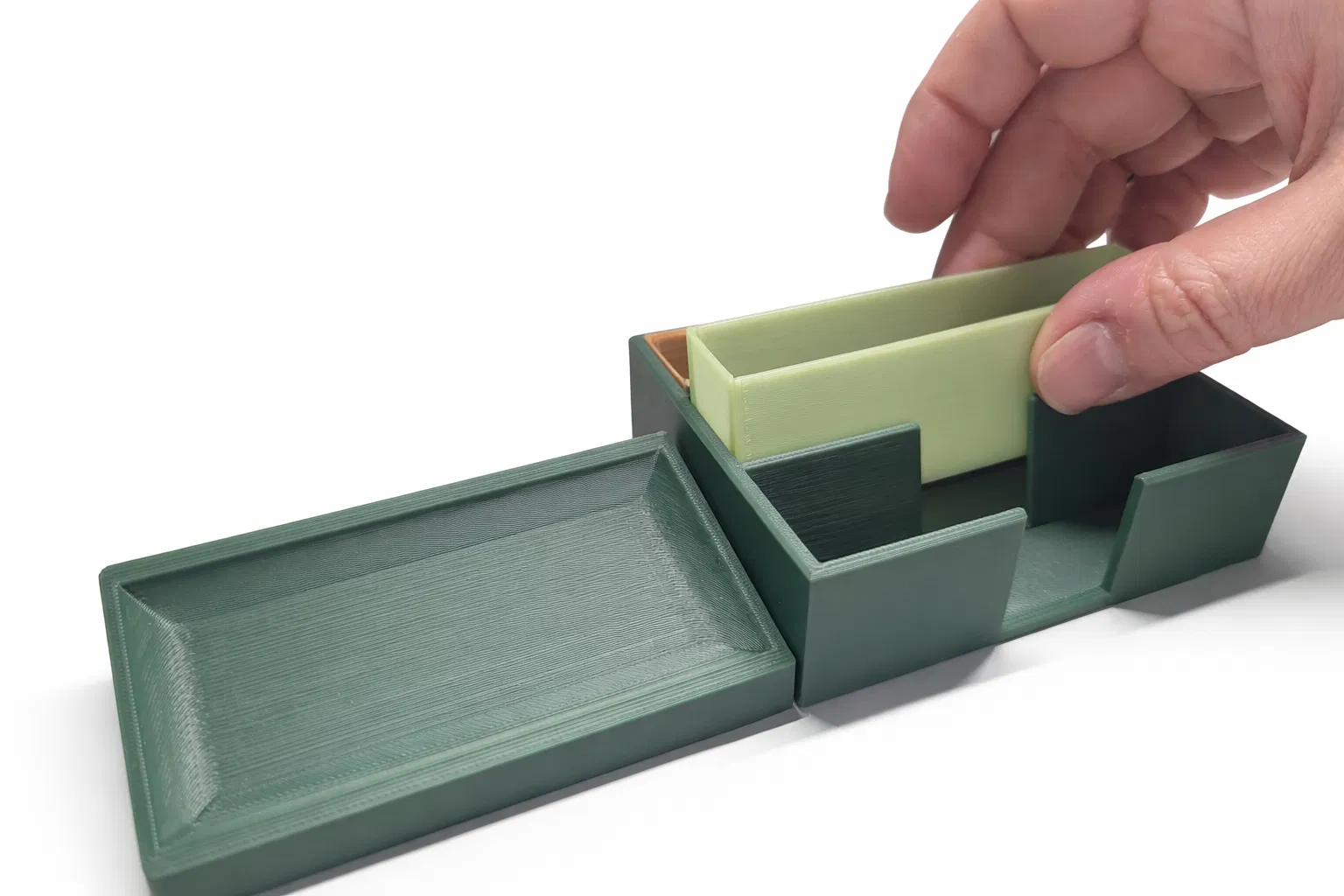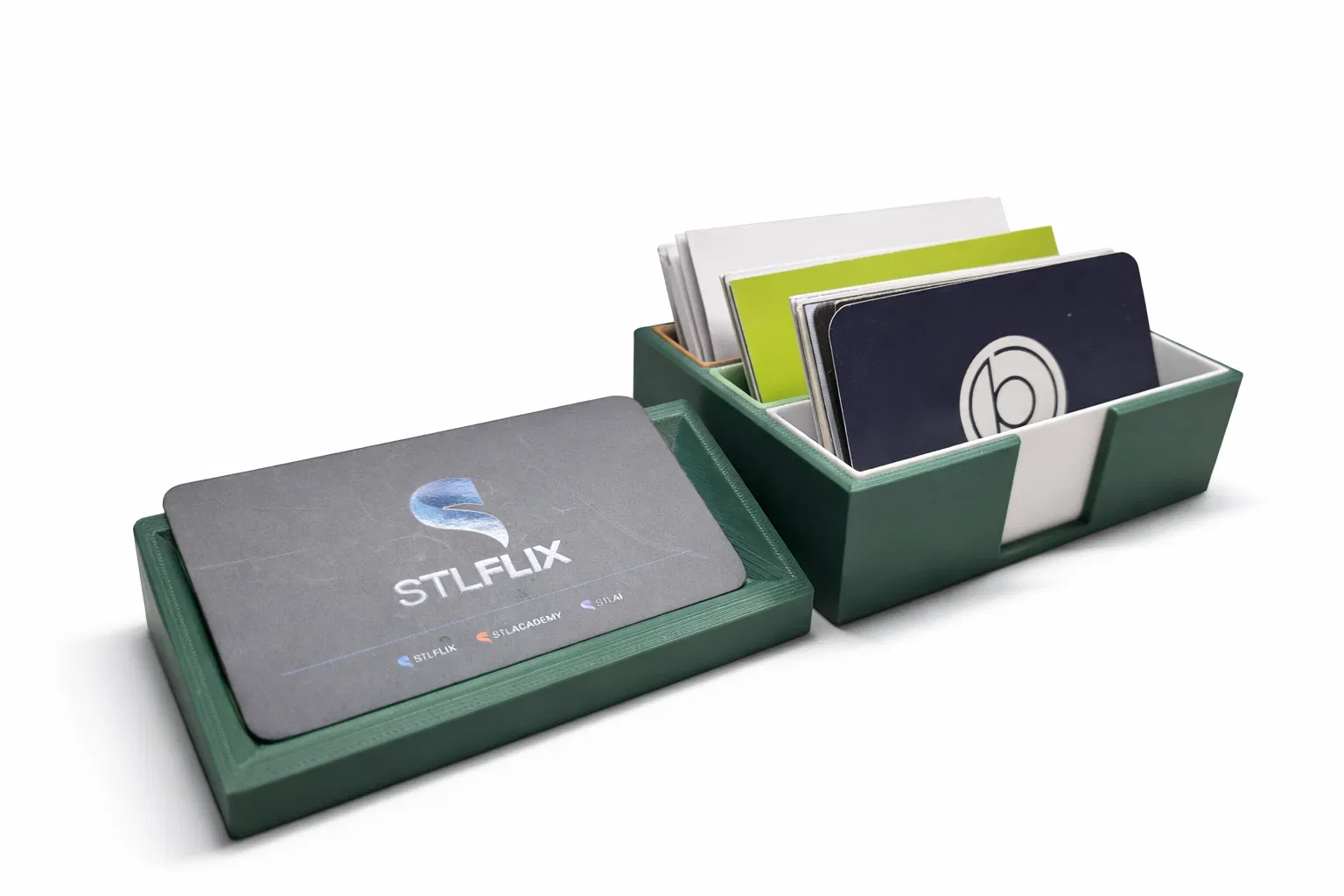 Organizer danh thiếp dạng modular gồm khay 3 ngăn và khay phụ bên trái, giúp phân loại card theo trạng thái. Hai phần nối bằng 2× nam châm Neodym 10×2 mm. In PLA tốt, thường không cần support.