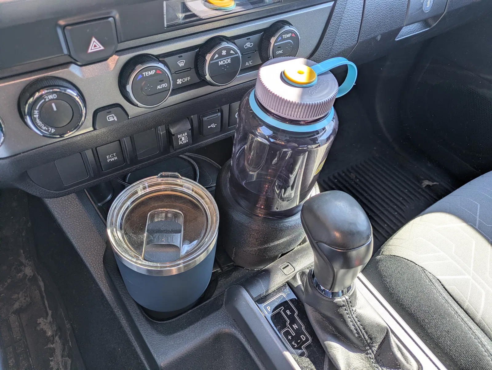 Bộ adapter khay để ly cho Toyota Tacoma đời 3, thiết kế để gắn vừa cả khay trước và khay sau, giúp giữ chắc bình Nalgene 32oz của bạn. Bản dùng cho khay trước có phần “thấp” hơn, kích thước tổng thể gần giống một bình Yeti 24oz; còn bản cho khay sau thì được vuốt côn nhiều hơn một chút để ôm vừa khay sau tốt hơn. Chỉ cần tròng thêm một ống foam koozy vào bình là khi đặt vào khay sẽ rất chắc, rút bình Nalgene lên cũng không bị kéo cả adapter lên theo.
