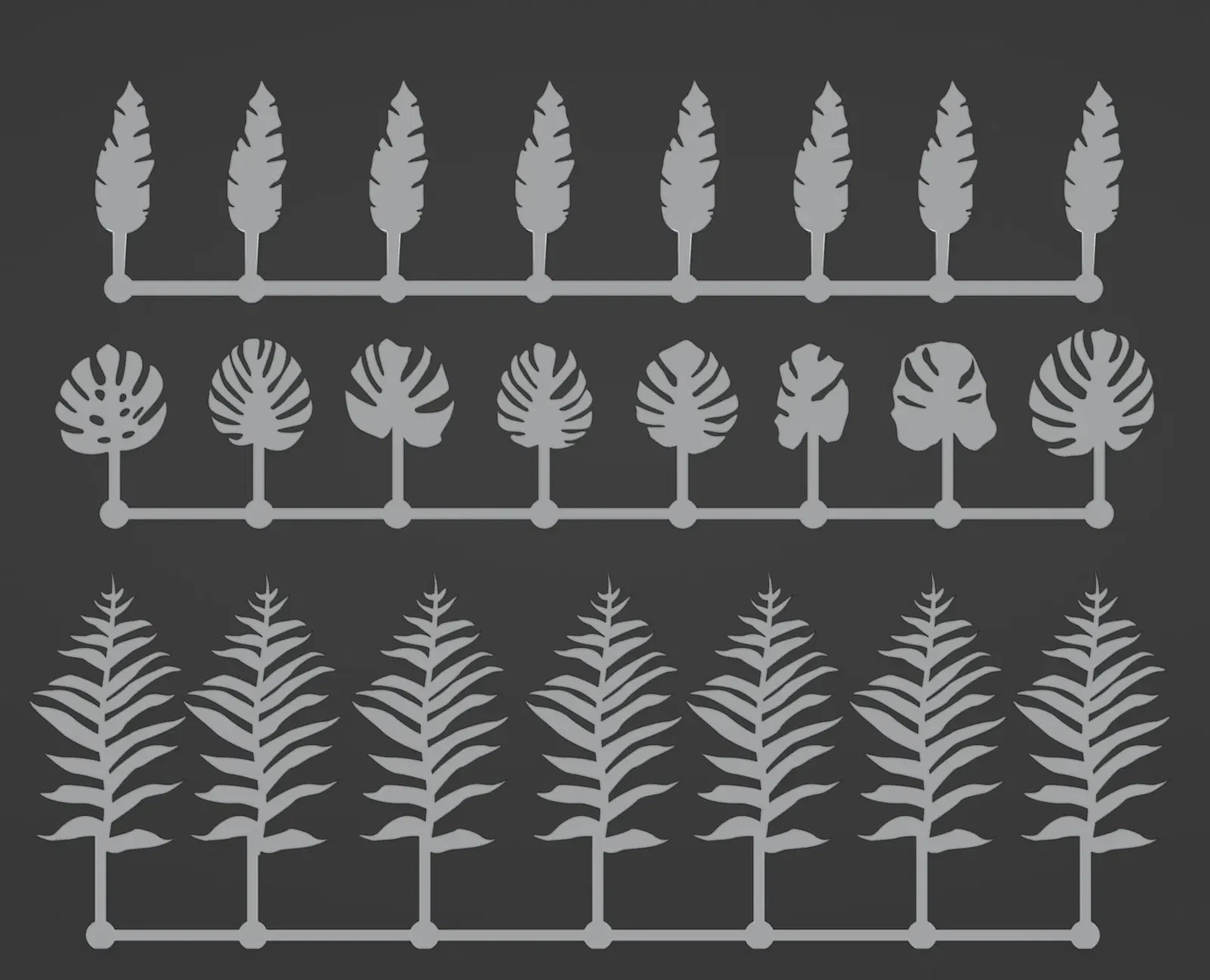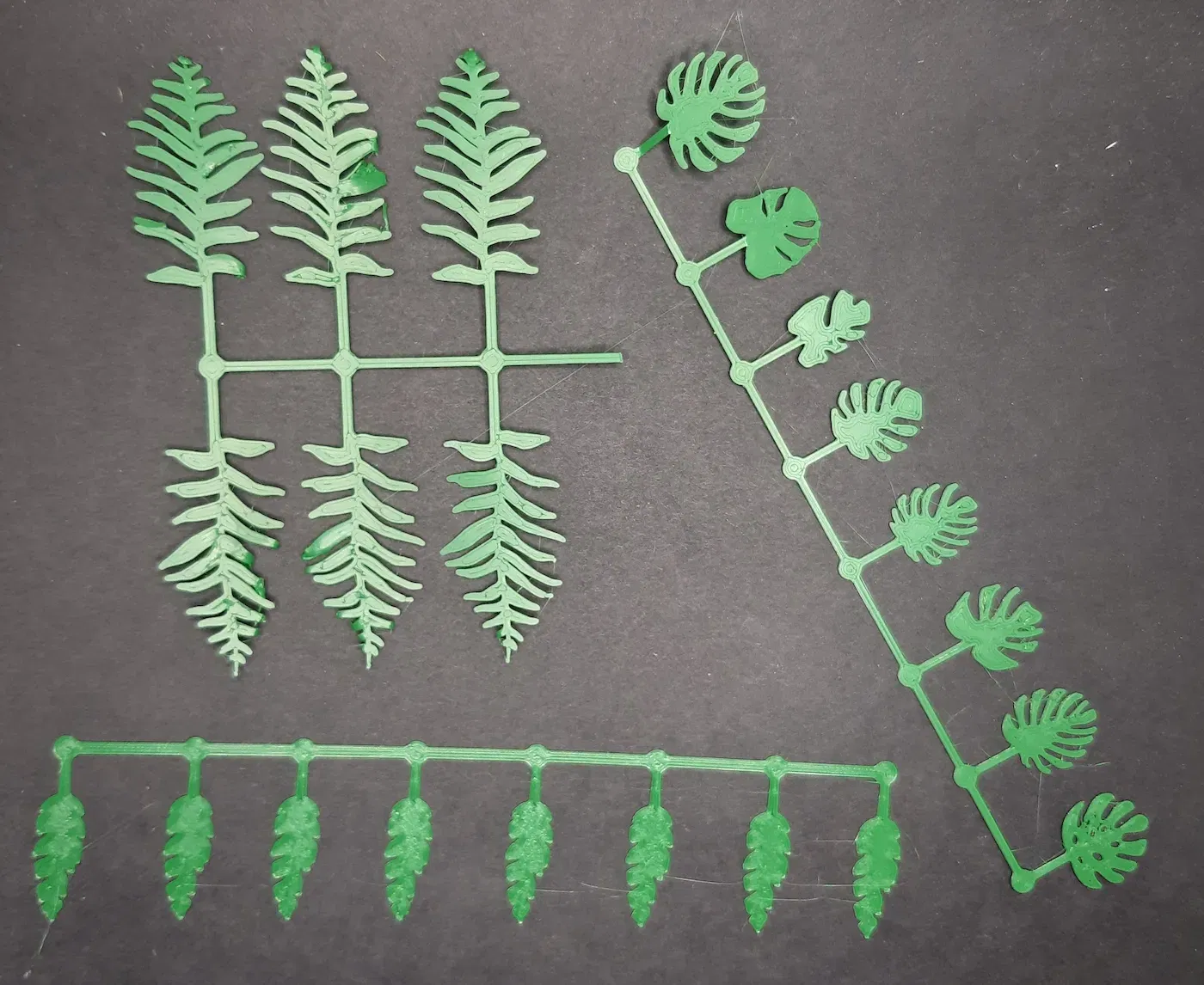 Ngoài ra, có tệp "fdm-plant-1.stl" với nguyên mẫu của tôi (để thử nghiệm khái niệm), và một số cây monstera khác có ba lá kết nối với nhau.