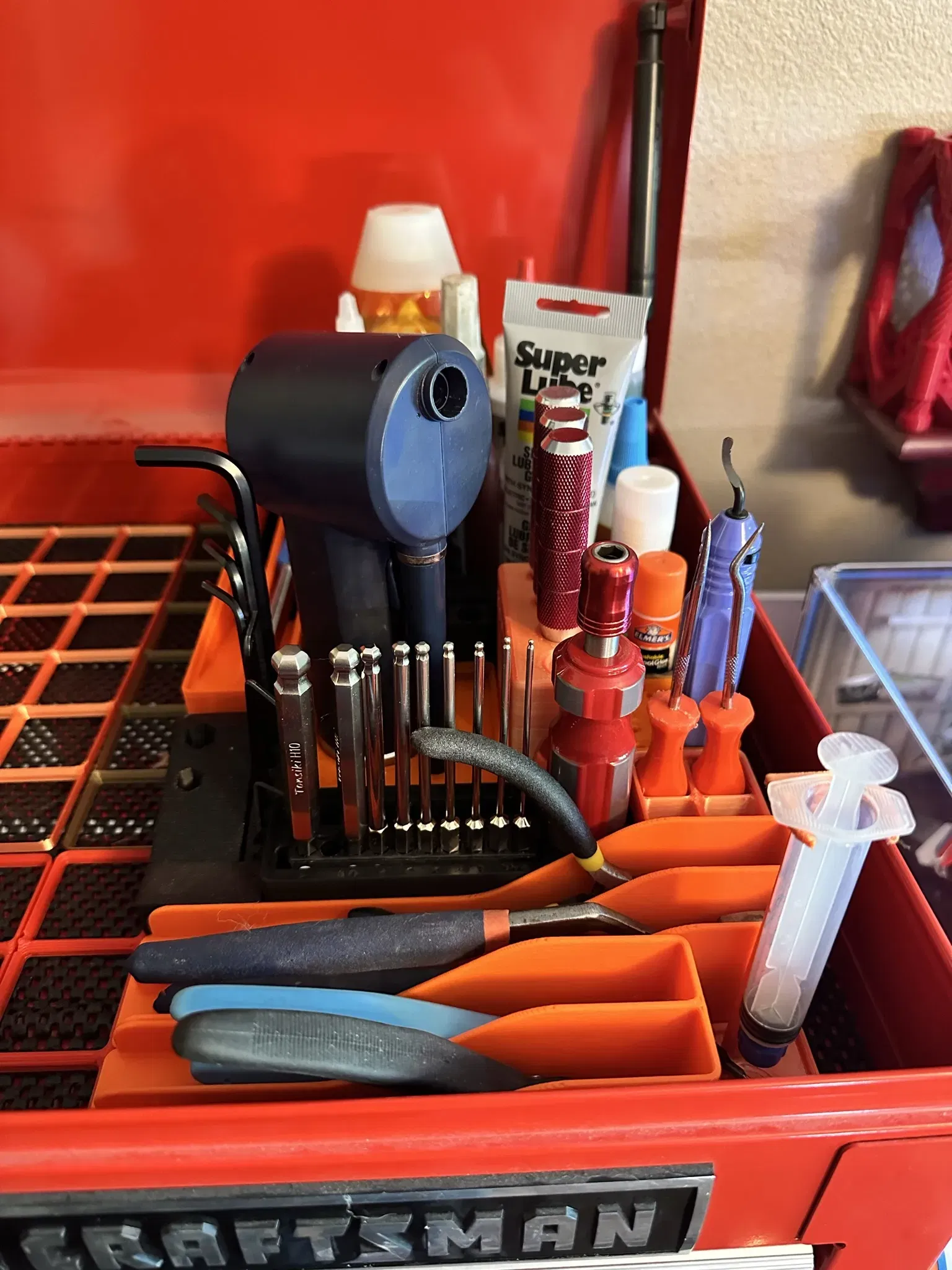 Đây chỉ là một mô-đun đơn giản cho dự án Gridfinity của Zack Freedman. Nó chứa một máy thổi chạy bằng pin Opolar. Nó cũng có thể chứa một máy thổi có thiết kế tương tự nhưng với tên nhà sản xuất khác. Thường thì tôi thấy cùng một món đồ với các tên công ty khác nhau trên đó. Nhưng nếu máy thổi của bạn có đường kính đáy khoảng 48mm, và đường kính vòi khoảng 9mm, nó có thể vừa.