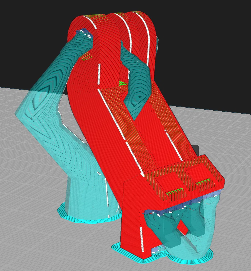 Dựng mẫu theo hướng đứng thẳng, thêm support blockers bên trong các rãnh. PETG có vẻ đủ bền. Các gờ để luồn zip tie sẽ nằm ngay ở miệng rãnh.