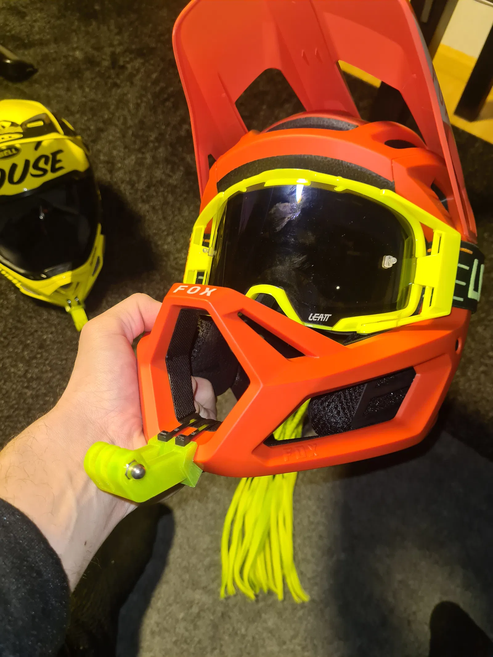 Ngàm gắn camera dưới cằm cho nón bảo hiểm Fox Proframe. Khi in, dựng mẫu thẳng đứng và đặt support blockers trong các rãnh. PETG được đánh giá là đủ cứng; gờ giữ zip tie nằm ở miệng rãnh.