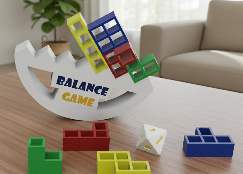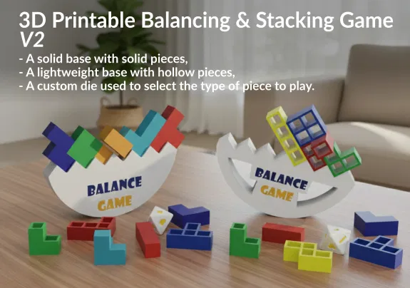 Phiên bản 2 của trò chơi thăng bằng & xếp chồng: có đế đặc + khối đặc, đế nhẹ + khối rỗng và xúc xắc 4 mặt để chọn loại khối. Tối ưu cho in FDM, không cần support, tiết kiệm vật liệu và dễ chơi.