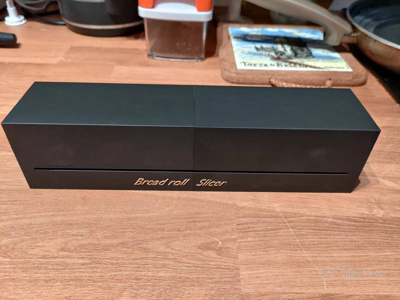 Mẫu dụng cụ giúp cắt bánh mì cuộn (rohlík) gọn gàng và đều tay. Phù hợp để in 3D làm đồ dùng bếp đơn giản, hỗ trợ canh đường cắt cho ổ bánh mà không bị lệch.