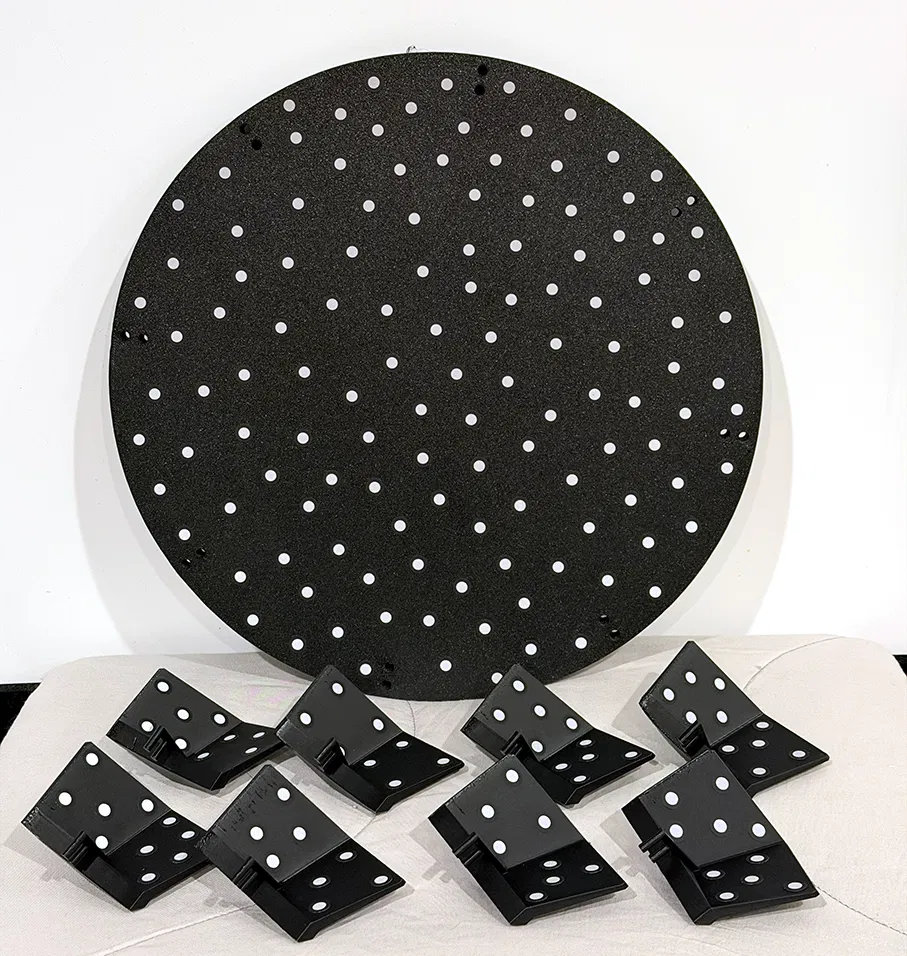 Trong quá trình làm, mình có thêm một số lỗ 5mm để gắn trụ (towers) hoặc các phụ kiện khác, ví dụ như các miếng “hip” đi kèm để thêm mục tiêu (targets) theo phương dọc khi scan đứng. Mình có đính kèm vài hình của bản in thô, và cả bản hoàn thiện đã dán marker RevoPoint 6mm (https://amzn.to/4kQ8fNl).