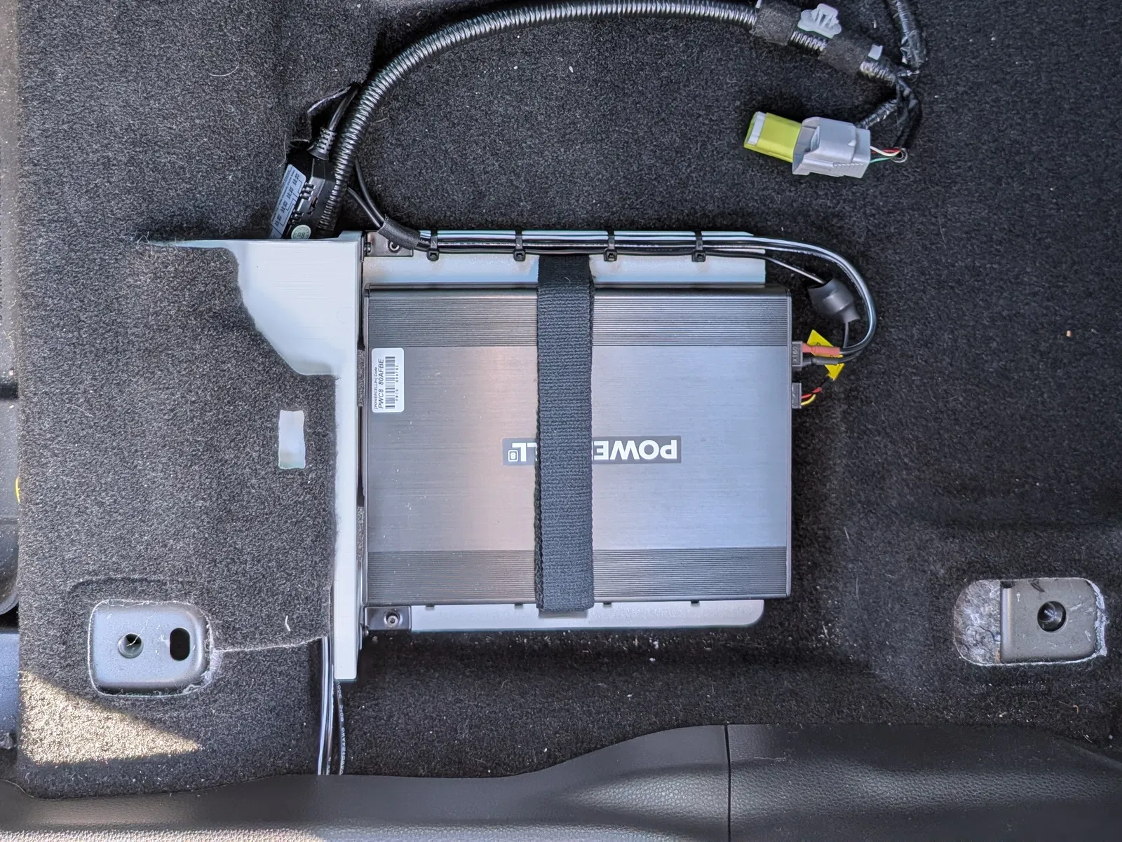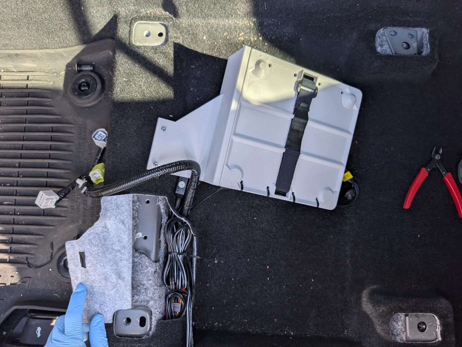 Chỉ dùng Velcro để dán pin dashcam lên thảm sàn xe có thể làm lớp Velcro bị giật rách khỏi thảm. Để tránh tình trạng đó, bộ mount này sẽ bắt cố định vào các lỗ bulông zin (OEM bolt holes) trên thanh ngang ghế lái (seat crossbar), vốn được Toyota thiết kế sẵn để gắn ampli JBL.