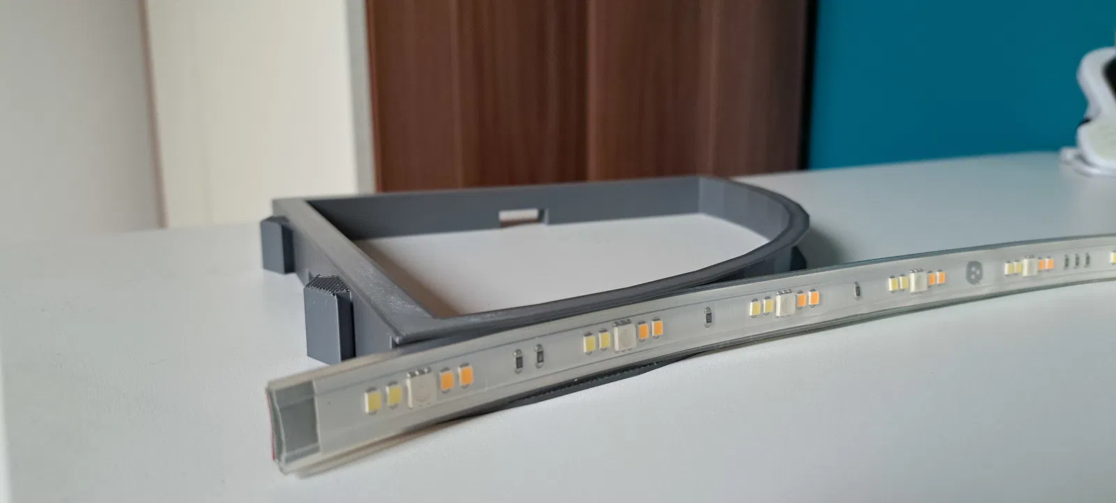 Mình muốn làm đèn nền cho gương tròn phòng tắm 50cm và cần một cái khung để gắn LED strip vòng quanh cho ngay ngắn. Vì phía sau gương đã có sẵn dây điện chờ, nên bộ khung 1/4 vòng tròn này (in 4x để ghép thành vòng tròn đường kính 45cm) sẽ giữ LED strip cố định đúng vị trí.