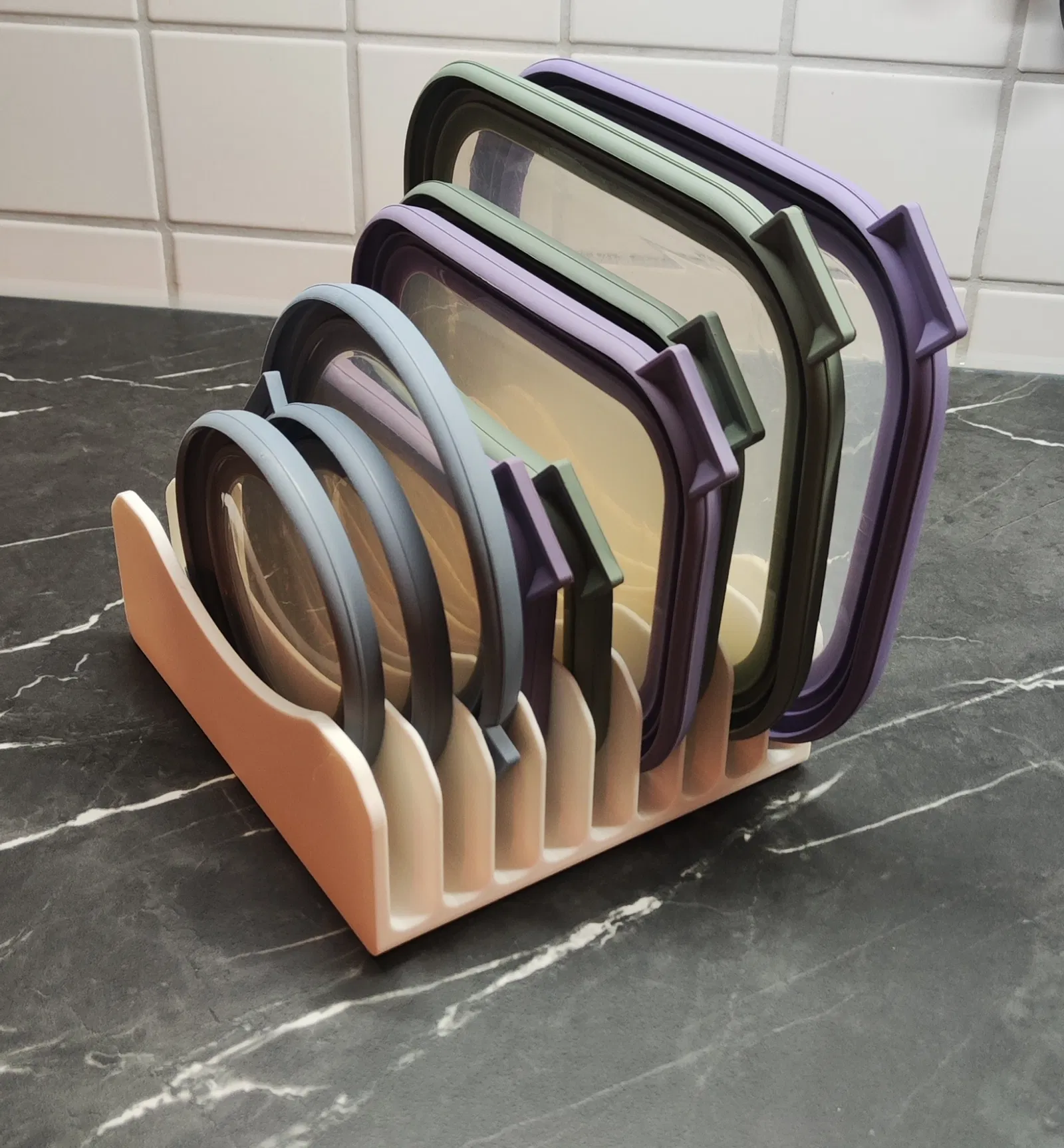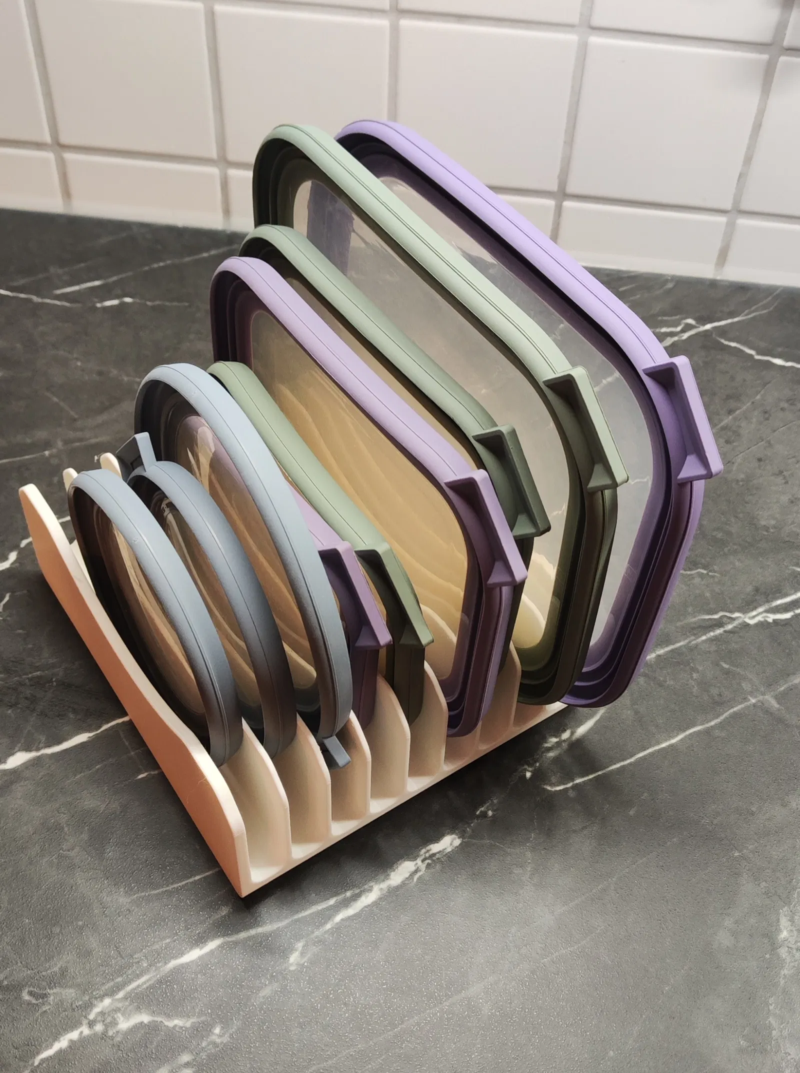 Mẫu giá đỡ nắp hộp đựng thực phẩm giúp sắp xếp nắp gọn gàng trong bếp. Đã được test thực tế với các hộp Mepal và Lock N Lock, phù hợp để tối ưu không gian và dễ lấy khi cần.