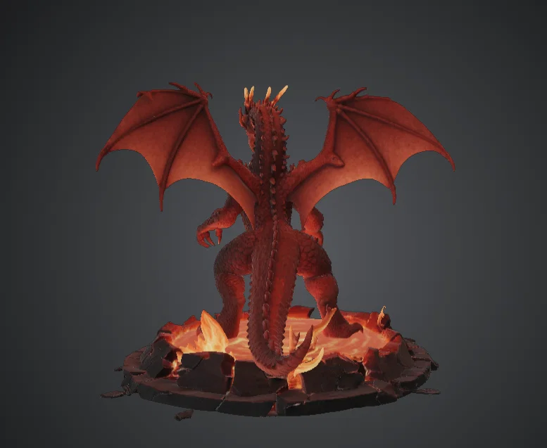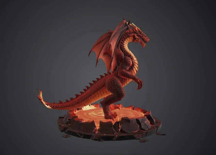Tác phẩm điêu khắc có chi tiết vảy nhiều lớp chạy khắp cơ thể, giáp ngực được gia cường, cấu trúc sừng nổi bật, và đôi cánh màng rộng được thiết kế để lên gradient sơn thật kịch tính. Bệ dung nham dạng tròn có bề mặt đá nứt và các rãnh dung nham, rất hợp để làm hiệu ứng phát sáng và hoàn thiện tương phản cao.